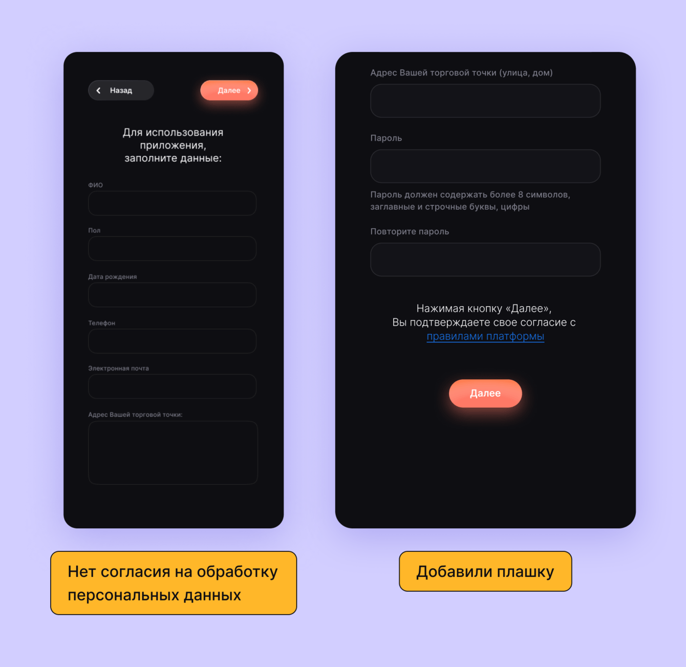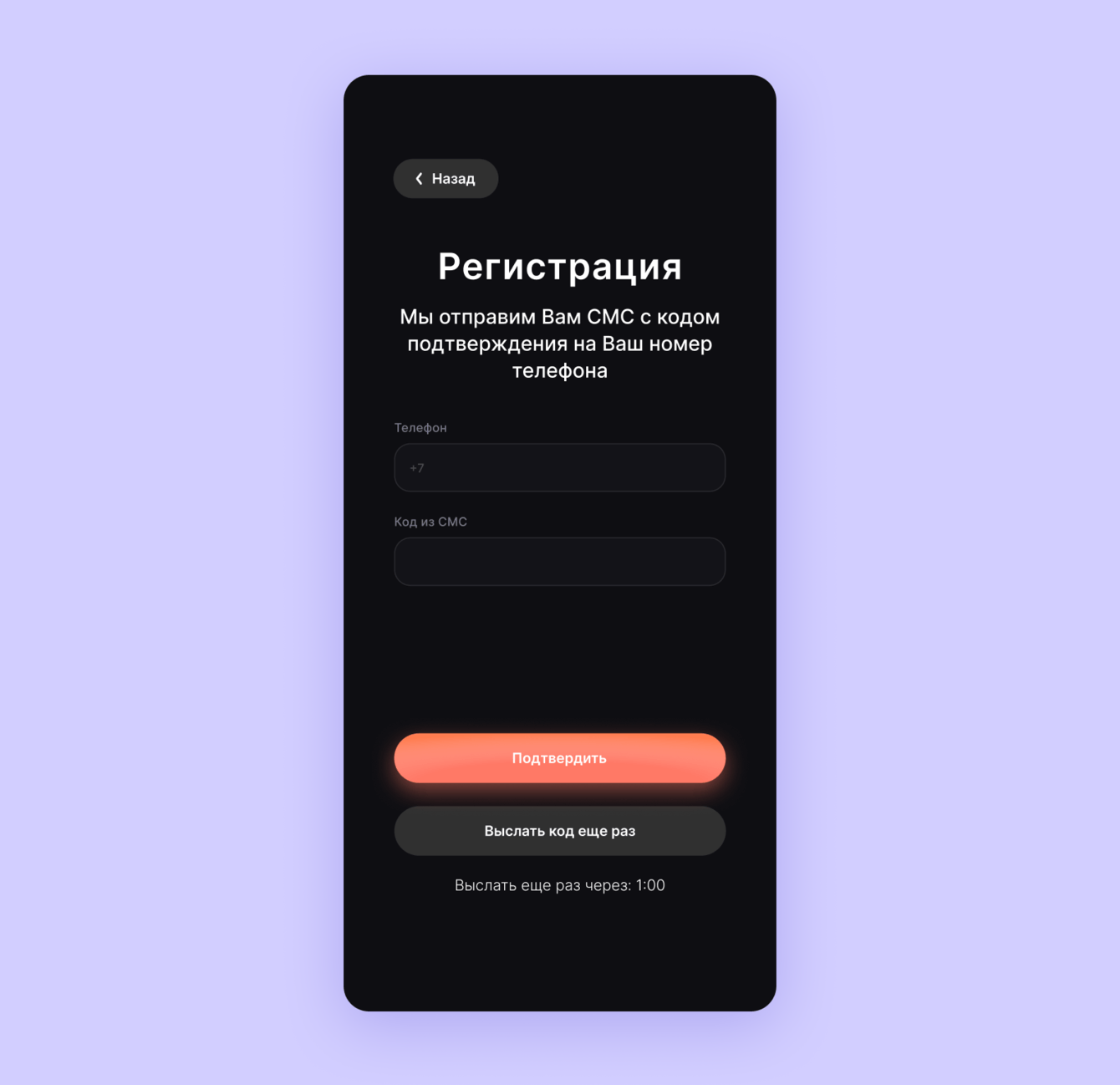 Другой пример: регистрируясь, пользователь должен ввести номер телефона и подтвердить его кодом из СМС — стандартный сценарий для многих приложений. Но в макетах для флоу регистрации отсутствовал экран с полем ввода телефона и кода. Мы его добавили.