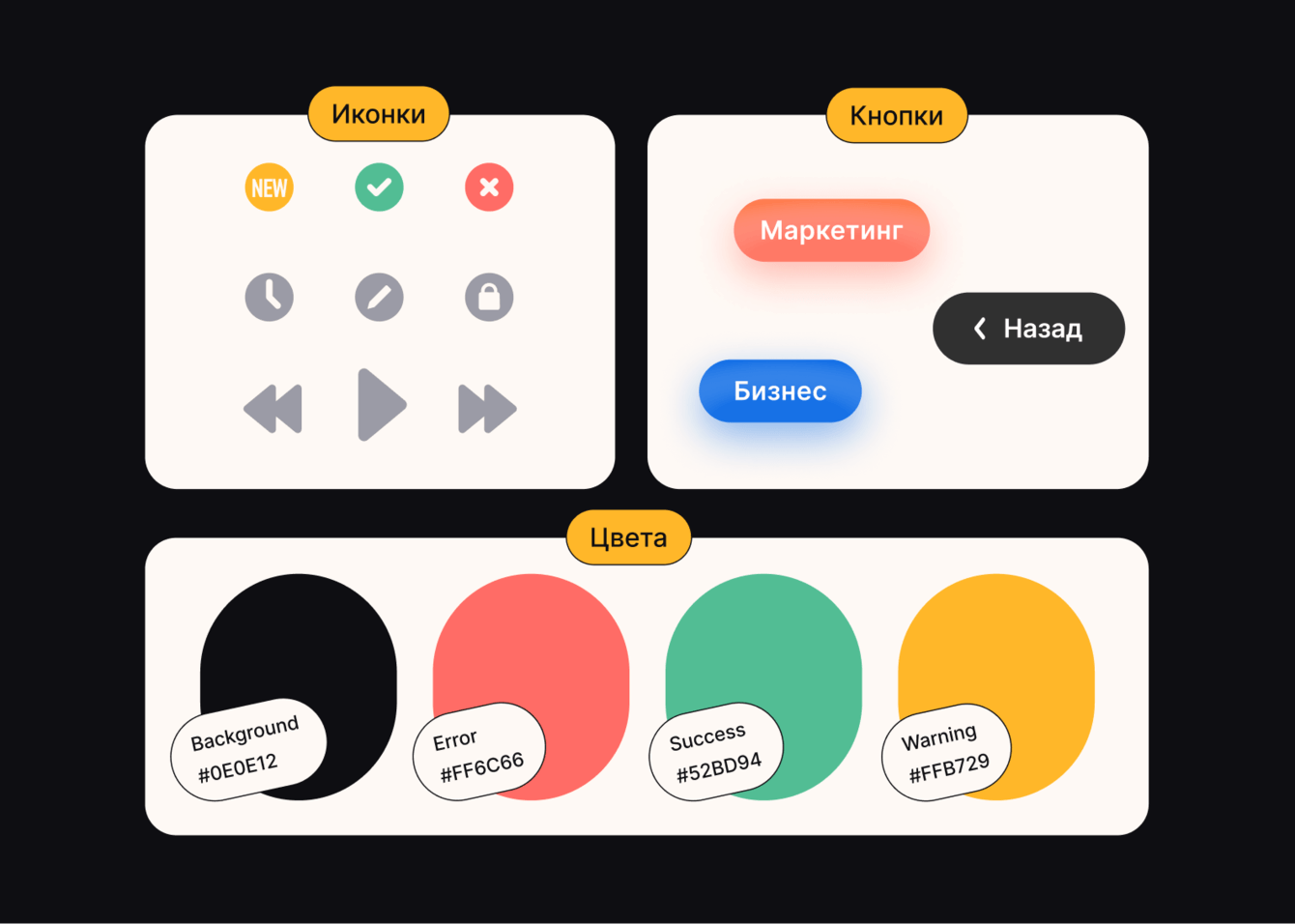 С UI-kit интерфейс выглядит единообразным и гармоничным. Он гарантирует, что дизайн на разных экранах согласованный — кнопки стоят с одинаковыми отступами от текста, и у логотипов один и тот же цвет.