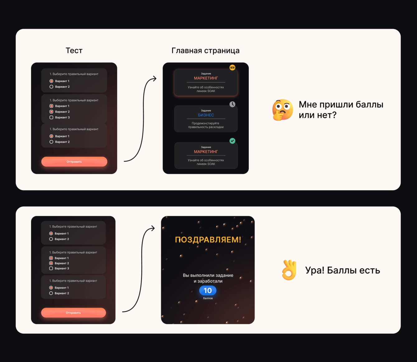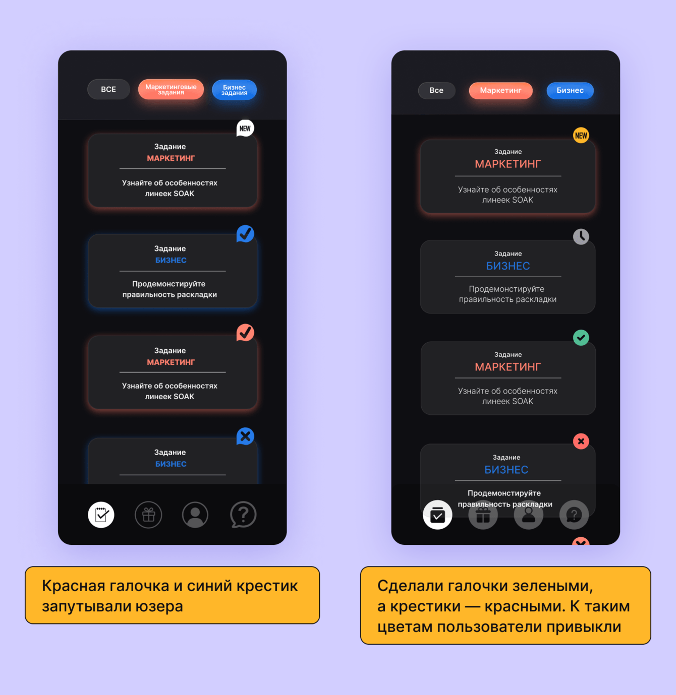 Например, если пользователь правильно ответил на задание, иконка загоралась красным — казалось, что юзер в итоге сделал что-то не так.