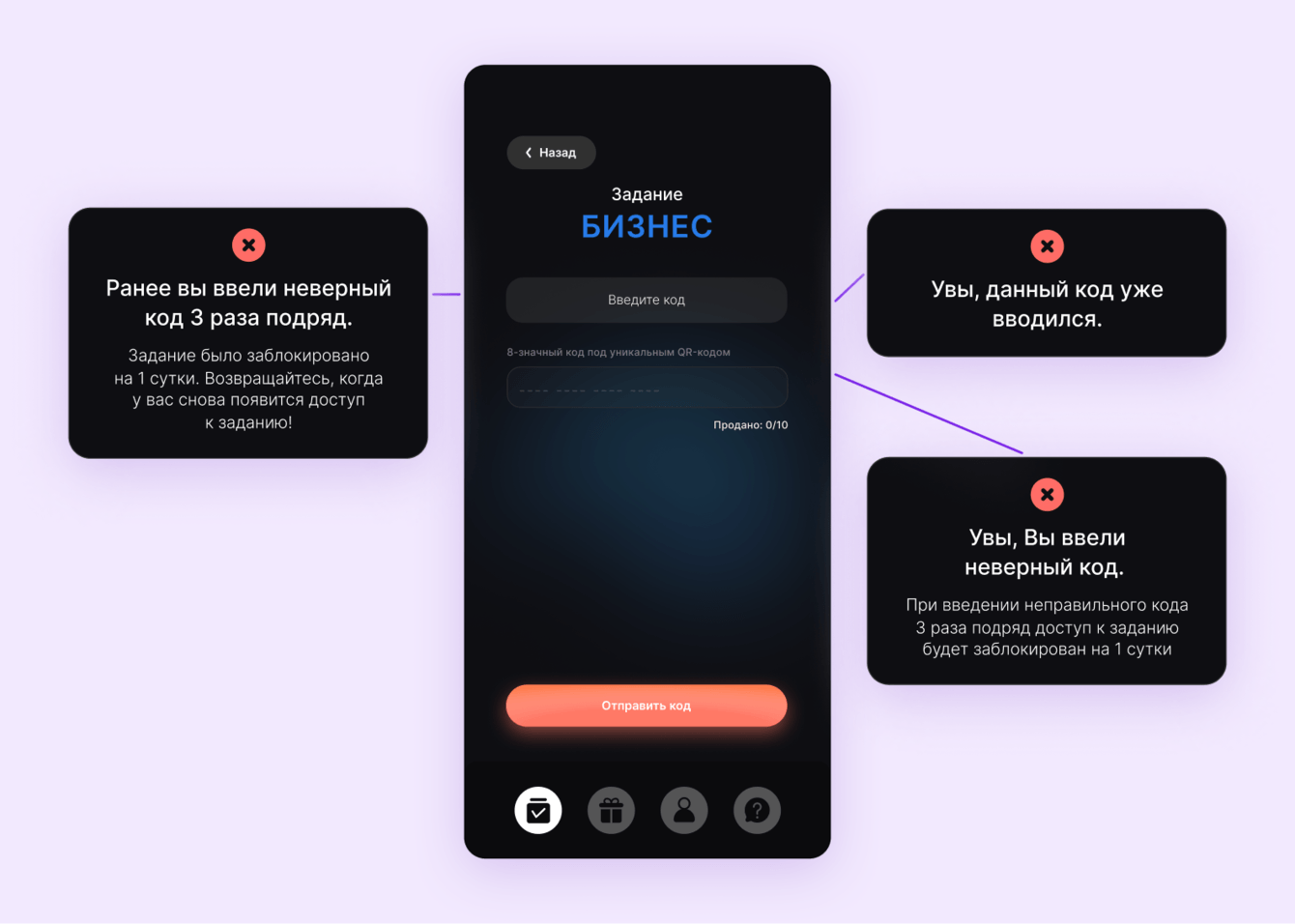 Это редкие сценарии использования приложения, но они важны для комфортного пользовательского опыта. Например, в приложении SOAK юзер, чтобы подтвердить выполнение одного из заданий, должен был ввести уникальный код. Нужно было учесть, что пользователь может ввести некорректные данные или попытаться повторно отправить один и тот же код, и добавить предупреждения для разных случаев. Иначе юзер бы не понял, в чем проблема и решил бы, что приложение «сломалось».