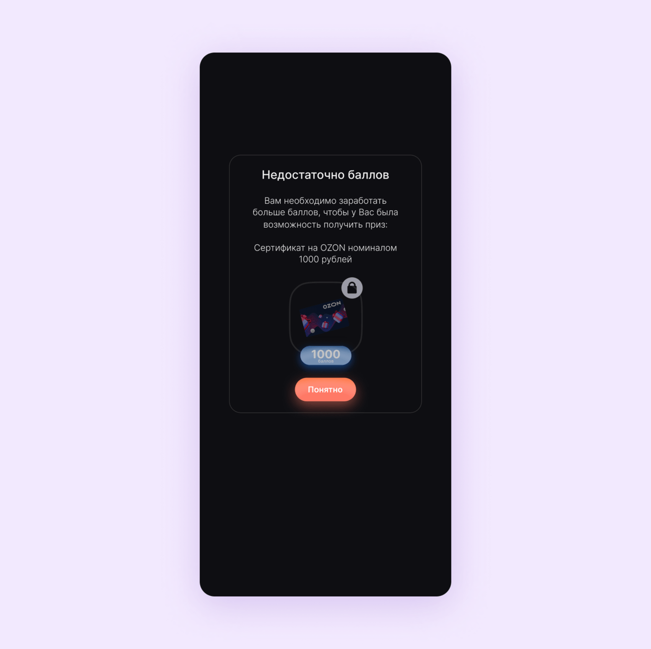 То же самое было с баллами. Если пользователь пытался забрать деньги и у него не хватало баллов, интерфейс ни на что не реагировал. Казалось, что приложение зависло. Поэтому мы добавили поп-ап с предупреждением.