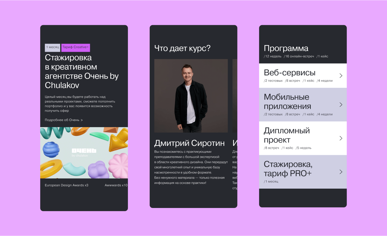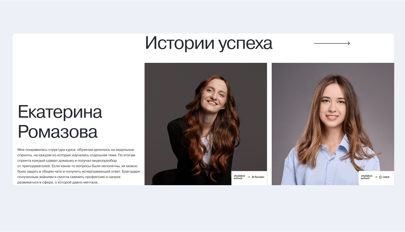 Атмосферу доверия и вдохновения, которые царят в Chulakov School, передали благодаря минималистичным решениям в дизайне. Они акцентируют внимание на важном контенте страницы, а не отвлекают пользователей.