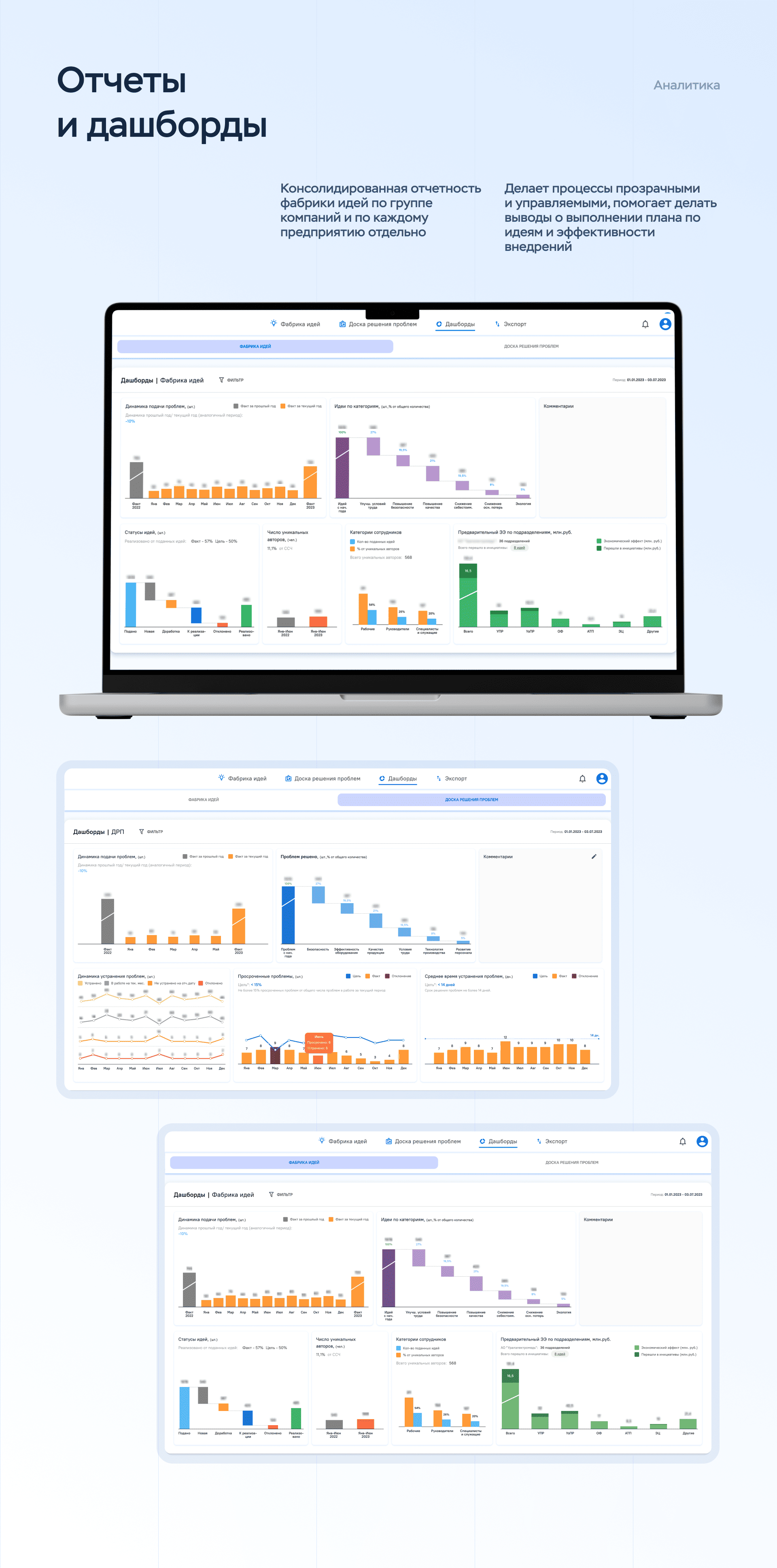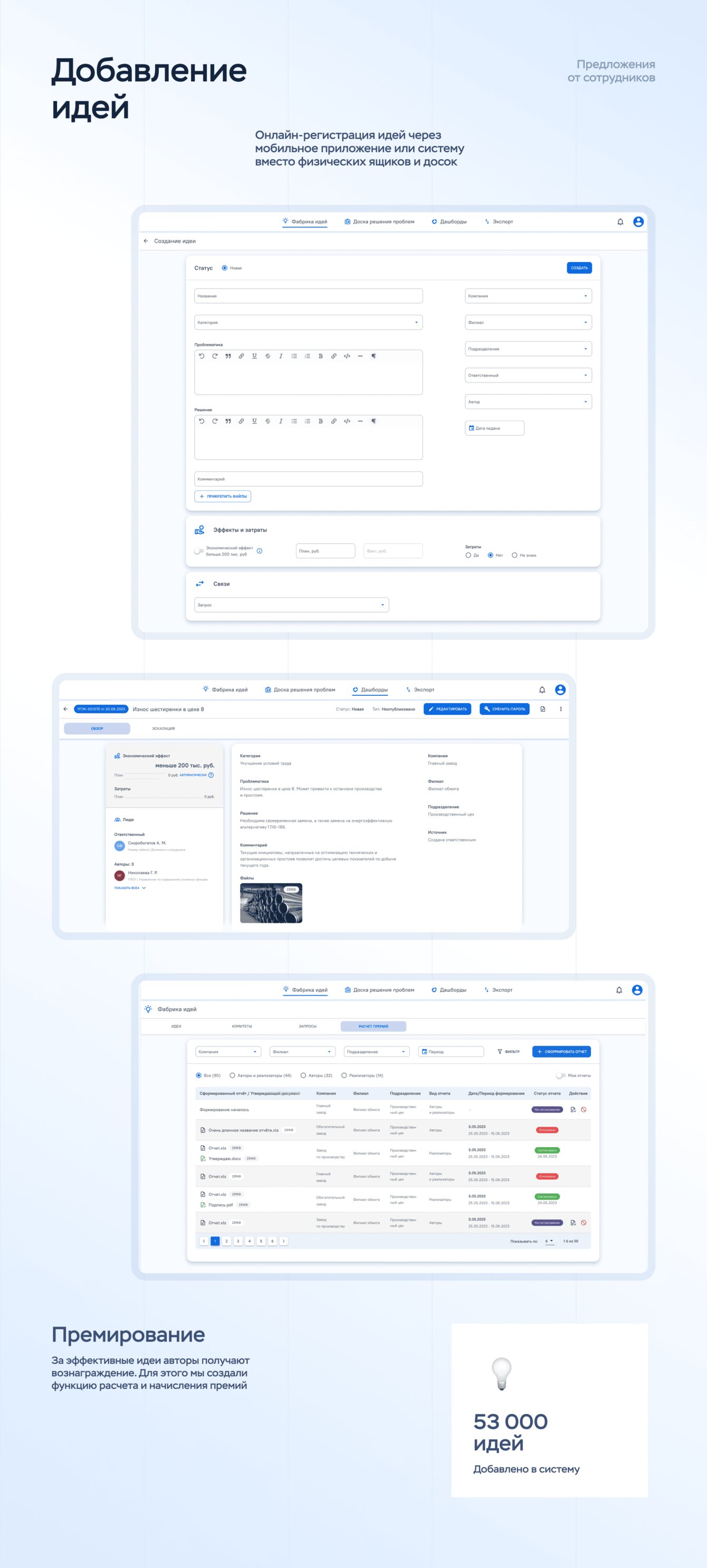 С нашим сервисом административная работа и работа с документацией занимает меньше времени, а сама фабрика идей стала прозрачной и управляемой. Теперь вместо бланков и разрозненных инструментов сотрудники решают все задачи от подачи идей до расчета эффекта в одном окне.