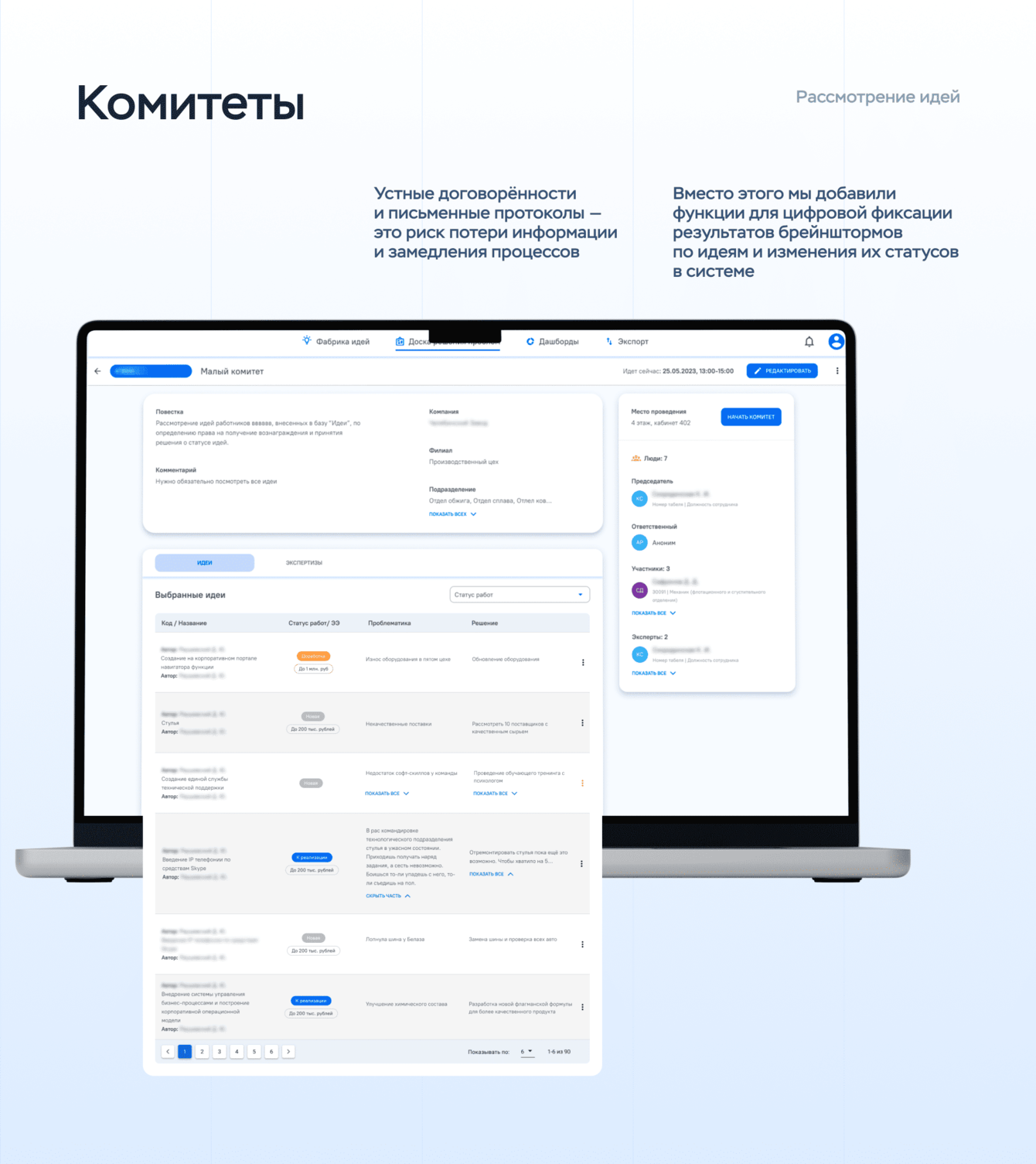 Вместо бланков — онлайн-подача идей через веб-версию или мобильное приложение. Оценка и утверждение идей проходят на цифровых комитетах. К созданному комитету можно прикрепить идеи из системы для рассмотрения, а также закрепить протокол и итоги встречи.