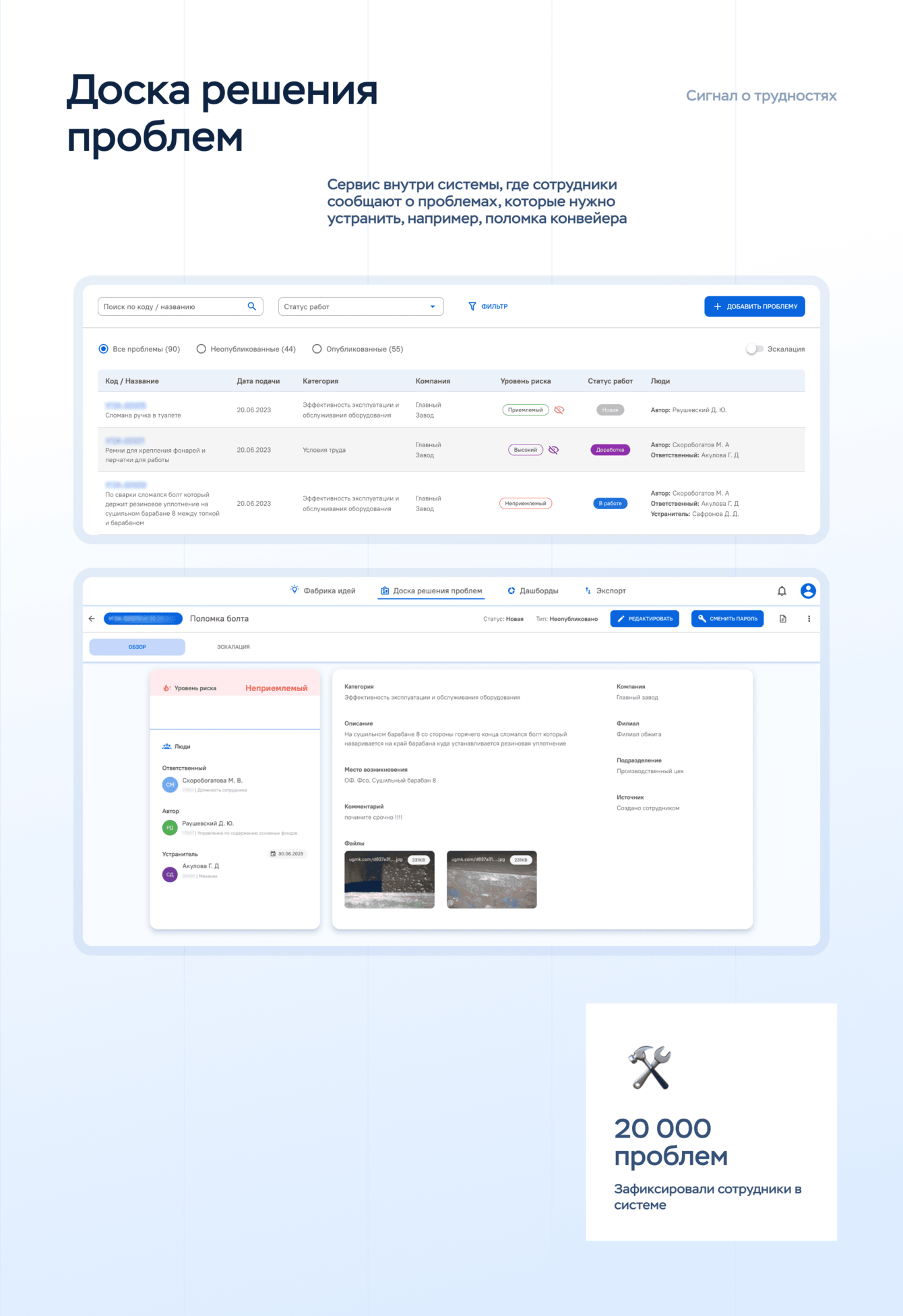 Наша цифровая фабрика идей — идеальный инструмент для управления производственными улучшениями. С нами заказчик отказался от готового решения и пошел по пути кастомизации и собственной разработки. Вместе мы создали продукт, настроенный под процессы и видение именно этой компании.