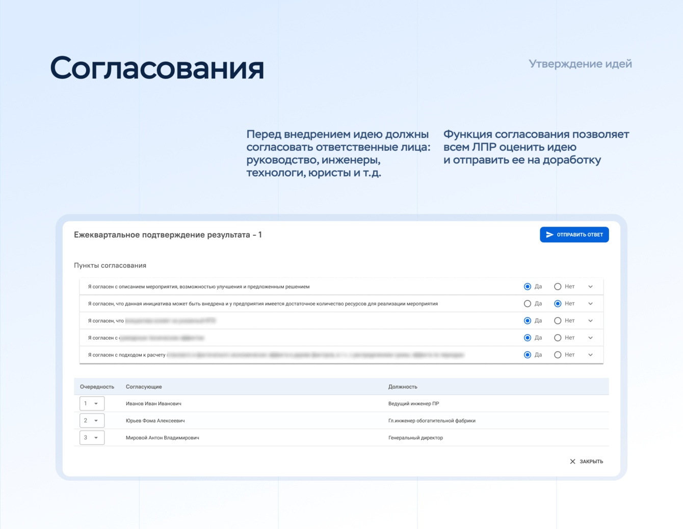 Функция цифровых согласований позволяет избежать лишних собраний и созвонов. Работает она так — после утверждения идеи собирают группу, которая непосредственно будет отвечать за внедрение. Например, инженер, технолог, руководитель цеха и производственный директор, финансист. Все эти люди должны согласовать план внедрения или отдельные вопросы по идее.