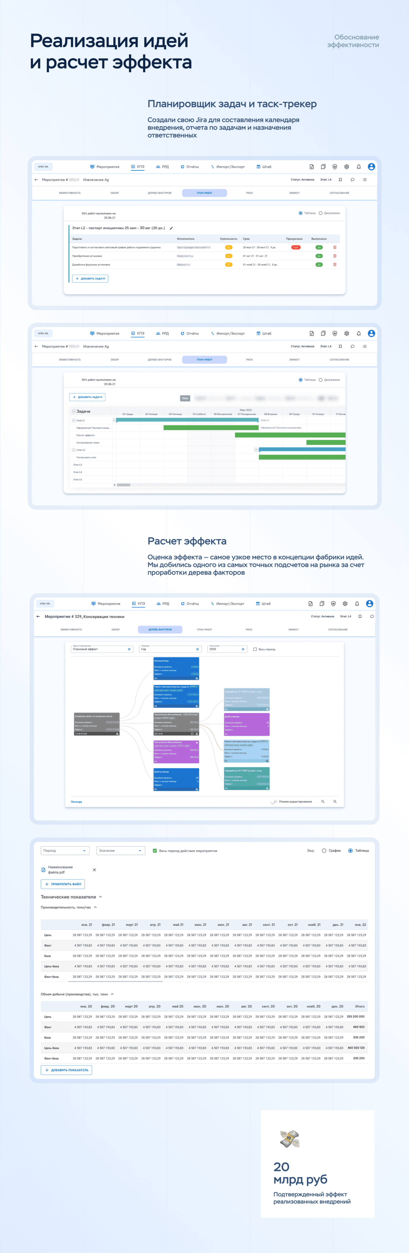 И одна из самых важных фичей — расчет экономического эффекта от внедрений. Мы реализовали один из самых точных расчетов результата на рынке за счет проработки дерева факторов — модели, которая учитывает влияние мероприятий на ключевые показатели производства: выручка, выпуск, процент брака и другие.