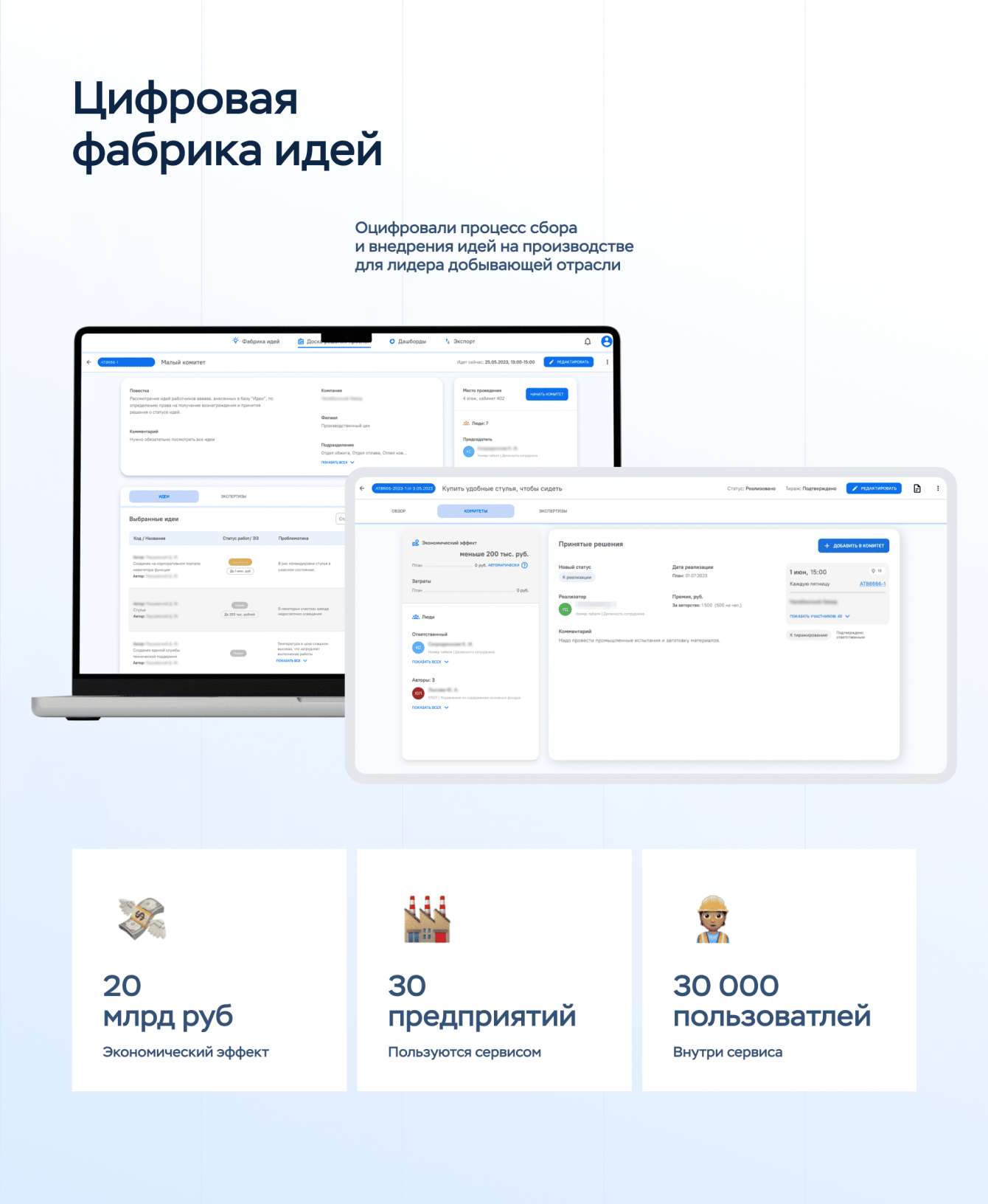 Заказчик обратился к нам за разработкой цифровой фабрики идей — сервиса по внедрению улучшений на производстве. Наш клиент — промышленная группа компаний с 30+ предприятиями.