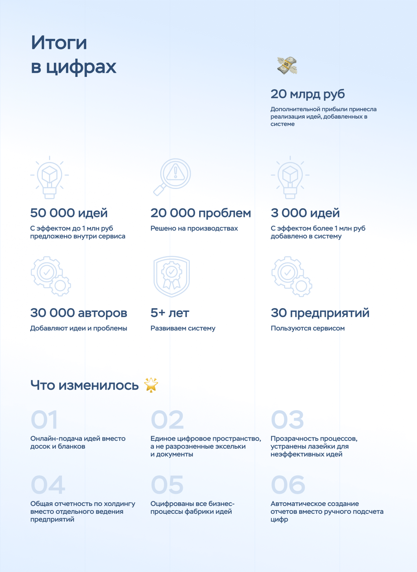 - 20 млрд руб — экономический эффект реализованных внедрений, которые были предложены в системе