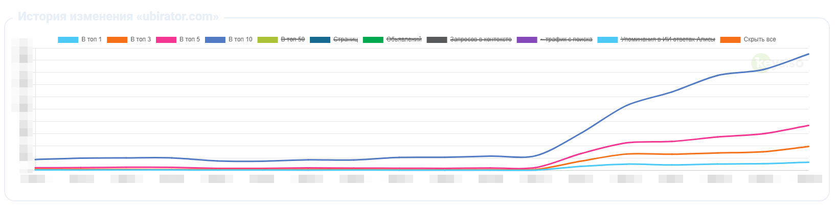 - Оптимизация под AI Overview: сайт был адаптирован под новые AI-форматы, что позволило увеличить долю переходов из AI-ответов Google до 10-15% от общего трафика по ряду кластеров.