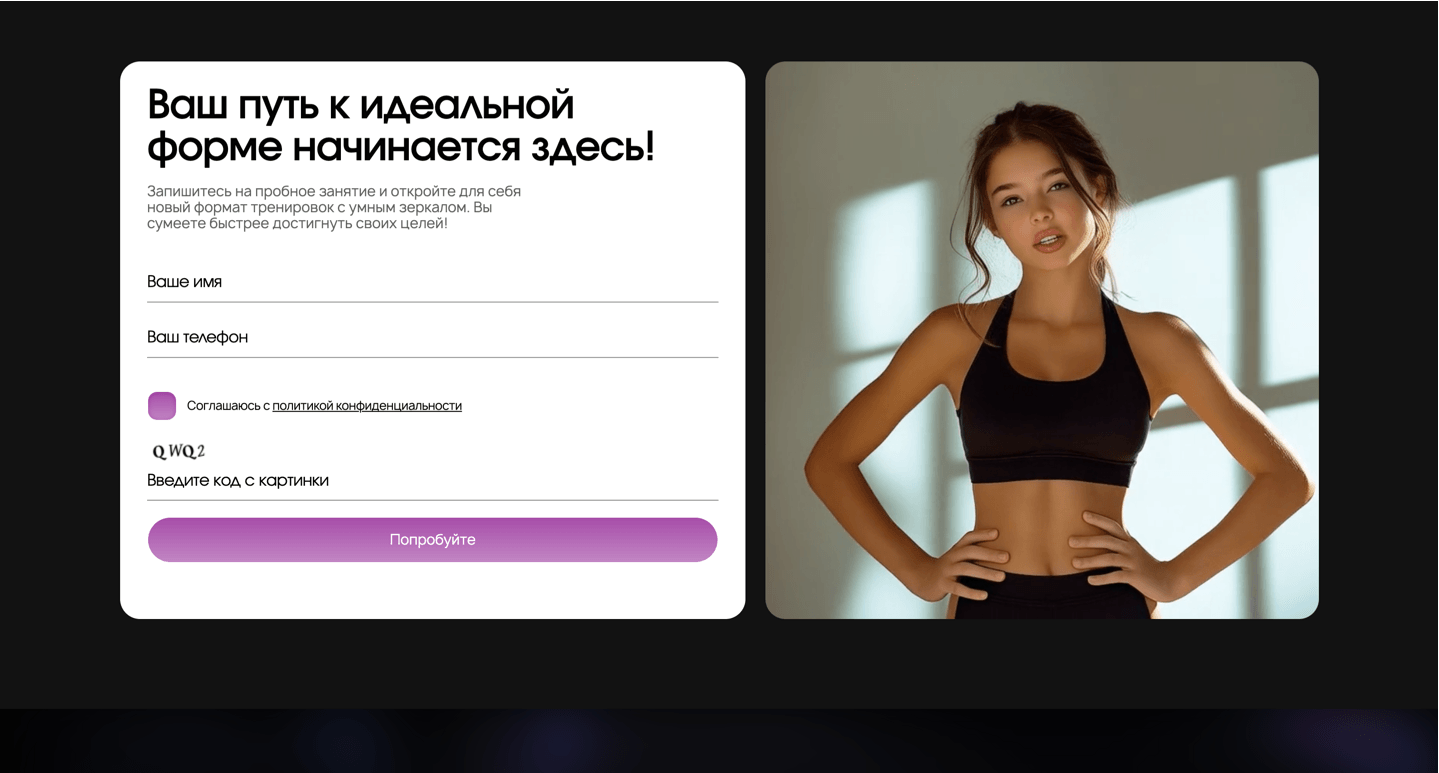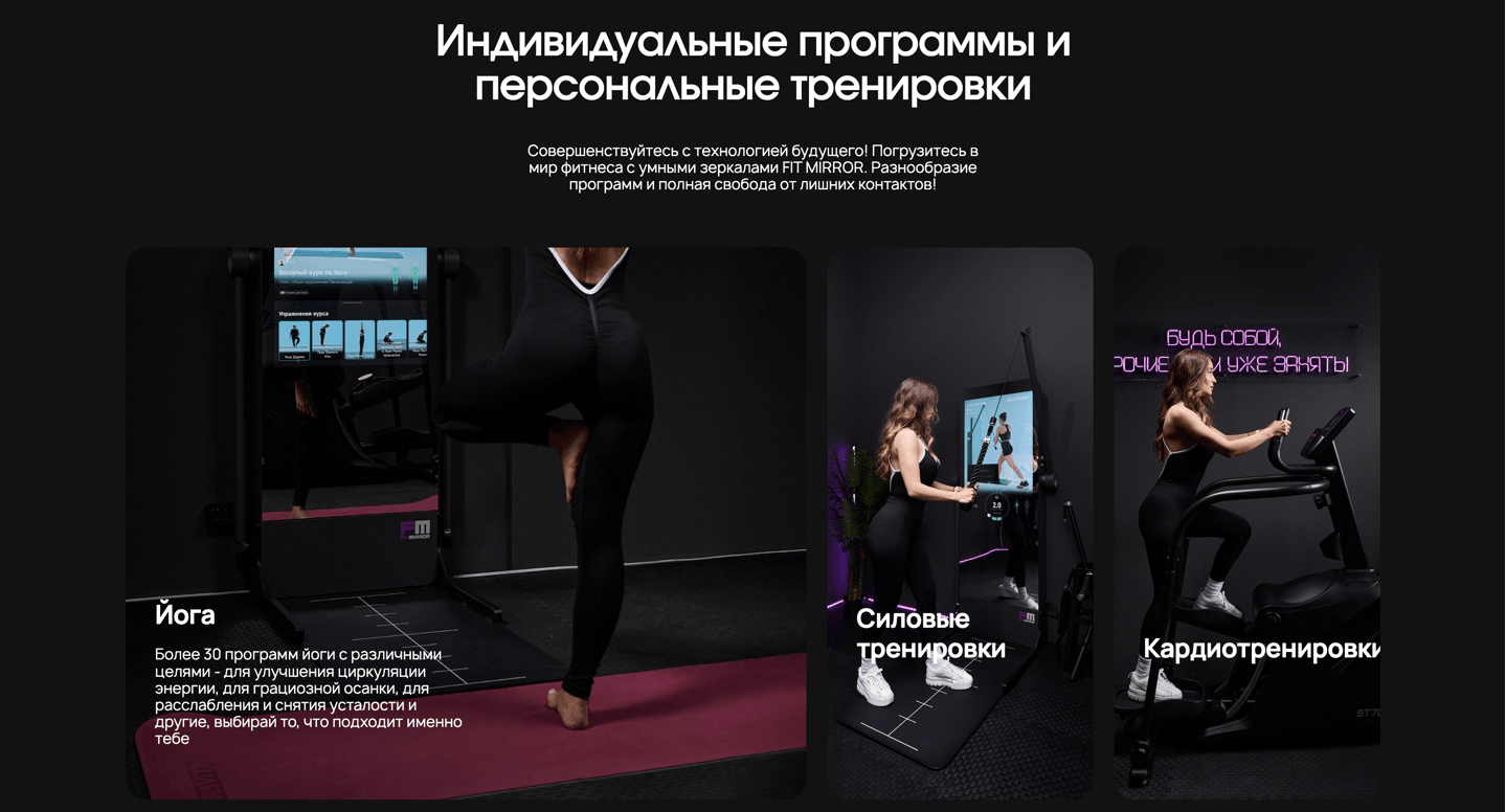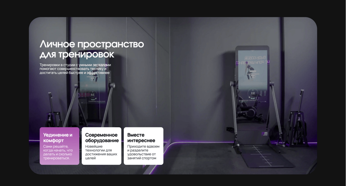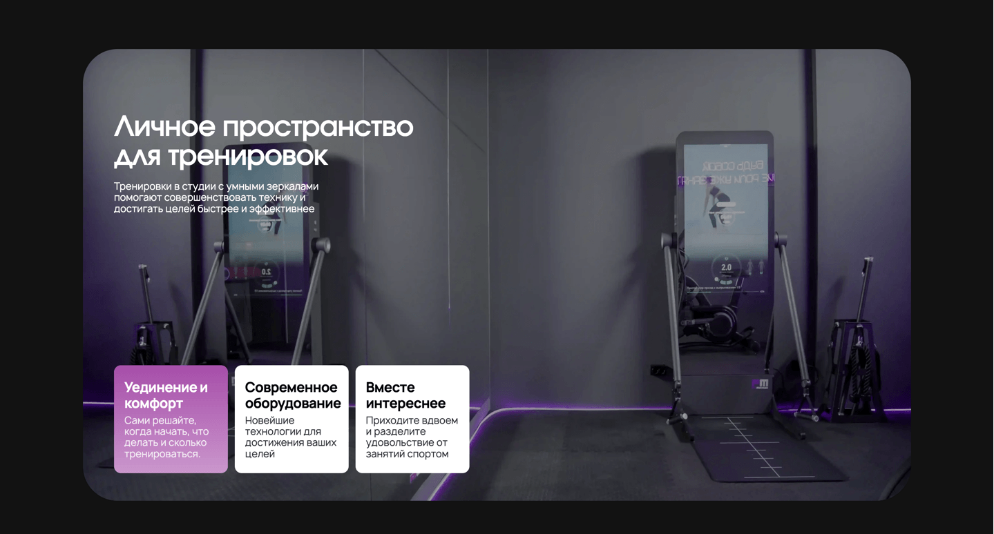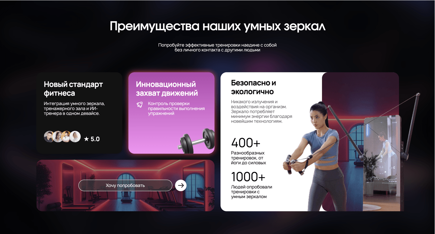 Мы упаковали сложные процессы - трекинг движений, коррекцию техники, подбор тренировок - в визуально понятные блоки и короткие продающие тексты.