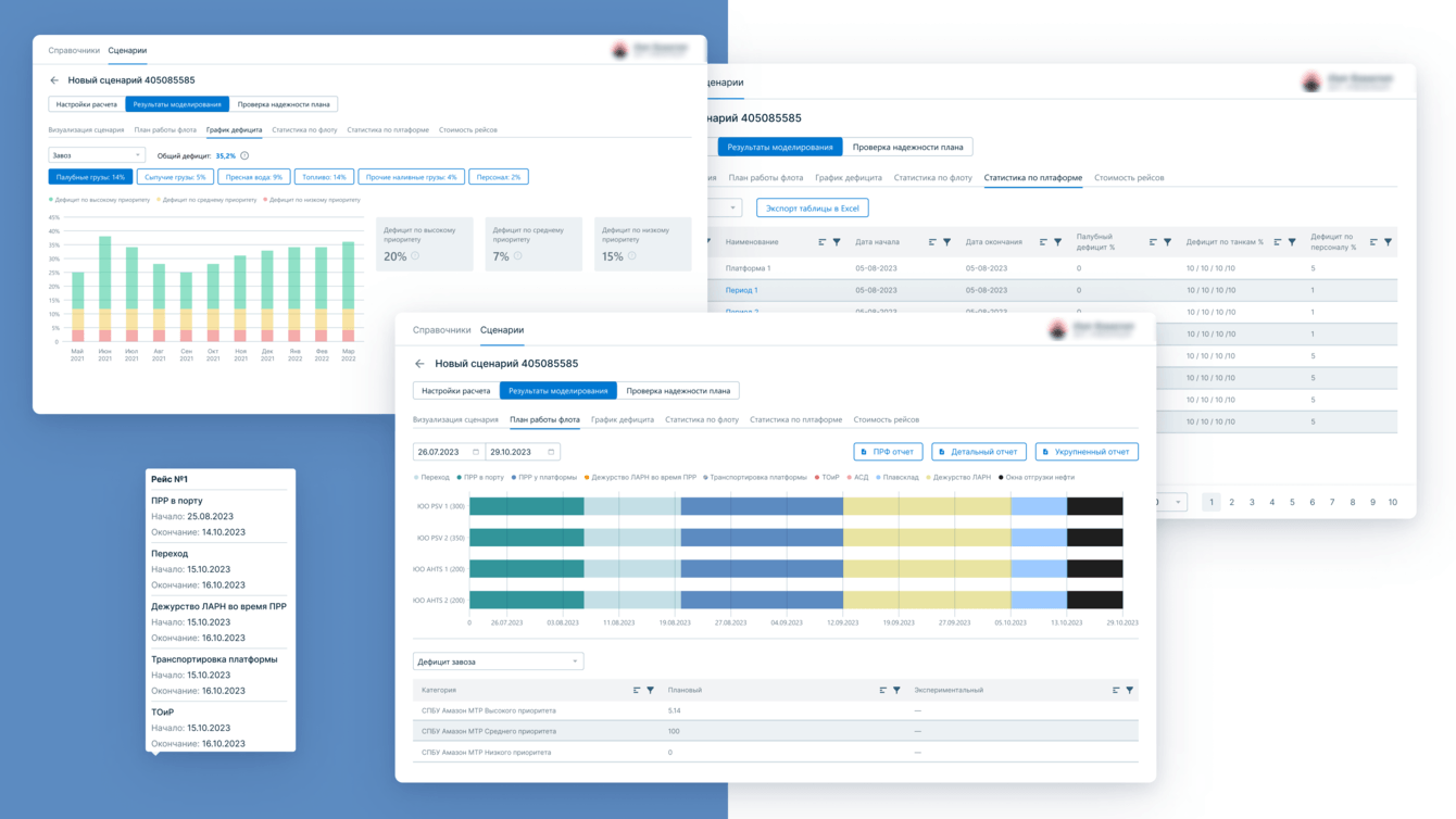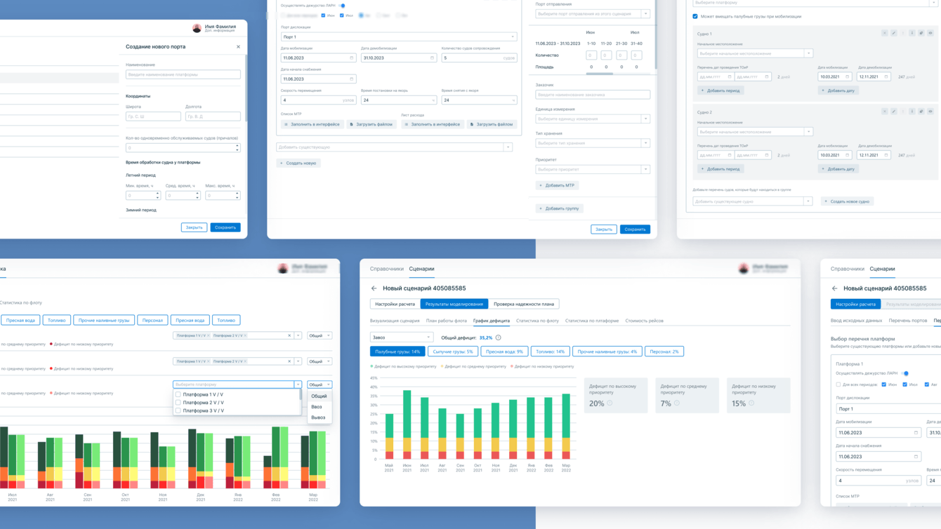 Решением стала система поддержки принятия решений в области планирования морской логистики на основе имитационного моделирования, разработка которой занимались мы совместно с «Газпромнефть-Снабжение». Основное отличие этой системы в том, что она функционирует на разработанном под задачу ПО, которое проектирует визуальную часть и состоит из веб-приложения с интерфейсами, движком имитационного моделирования и BI-аналитикой. Всё в одном окне.
