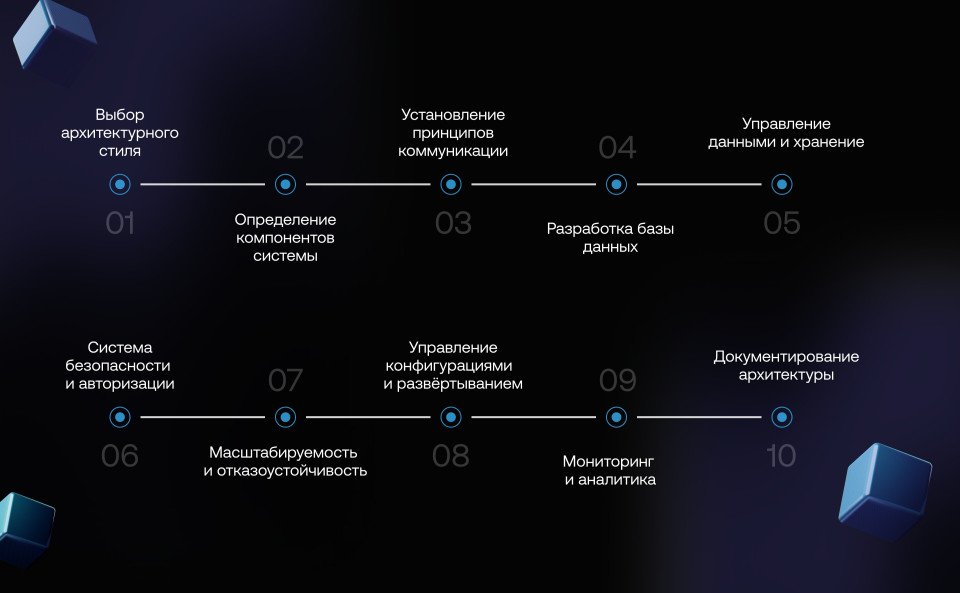 Выбор архитектурного стиля — Определение компонентов системы — Установление принципов коммуникации — Разработка структуры базы данных — Определение стратегии управления данными — Проектирование системы безопасности и авторизации — Масштабируемость и отказоустойчивость — Управление конфигурациями и развёртыванием — Мониторинг системы и аналитика — Документирование.