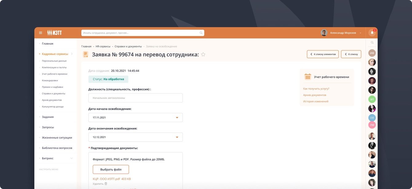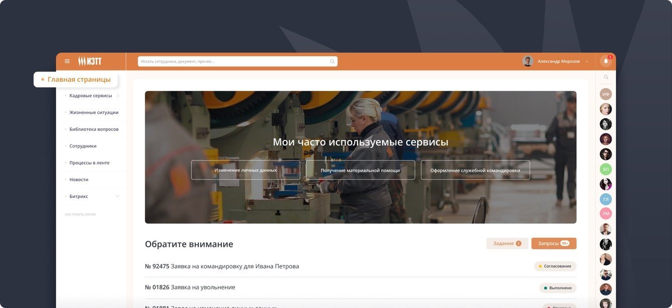 В связи с ростом команды и увеличением кадровых запросов на Ижевском заводе тепловой техники (ИЗТТ) возникла необходимость создать единую точку доступа к сервисам и информации, предоставить инструменты для оперативного получения HR-услуг и взаимодействия сотрудников с отделом кадров.