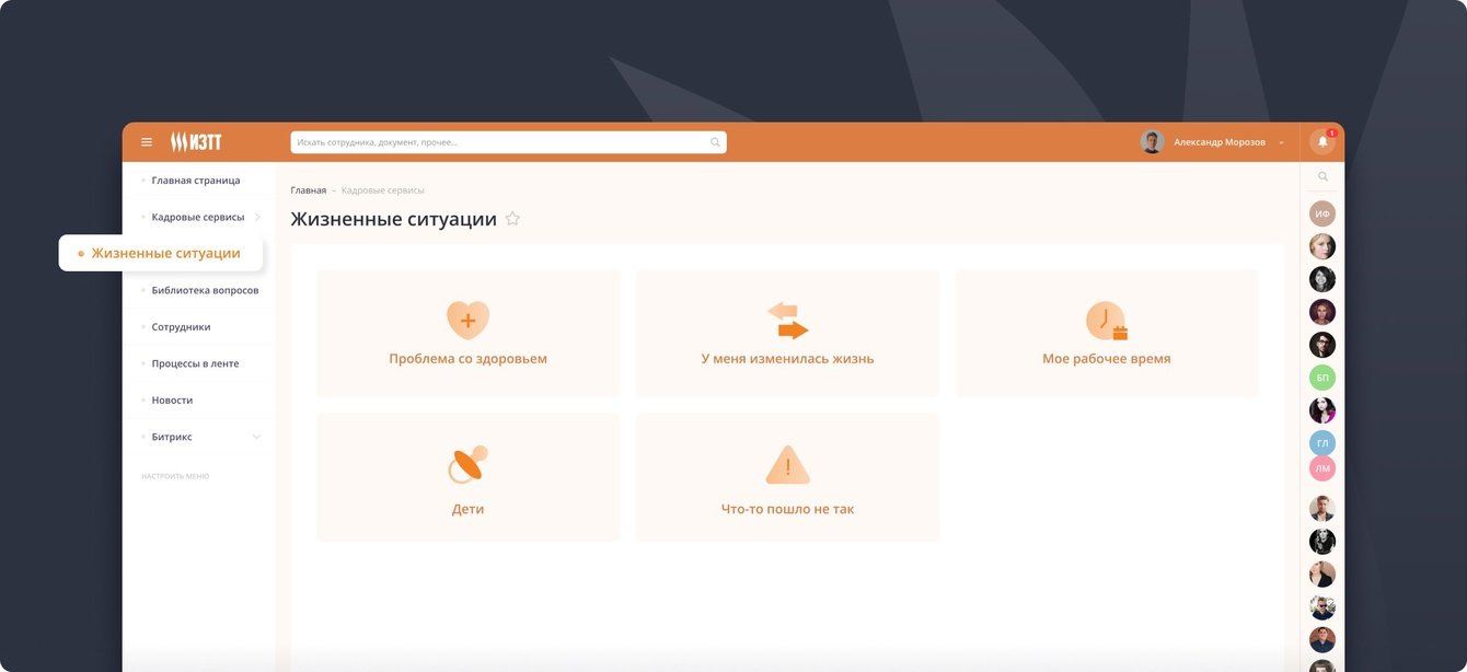 Для того чтобы сделать личный кабинет более понятным и дружественным для пользователей, была внедрена альтернативная система поиска необходимых HR-сервисов на основе жизненных ситуаций. При выборе определенной ситуации, пользователь автоматически перенаправляется на страницу со списком подходящих сервисов. Это удобное решение позволяет сотрудникам быстро находить необходимые HR-сервисы и создает позитивный опыт работы с личным кабинетом.