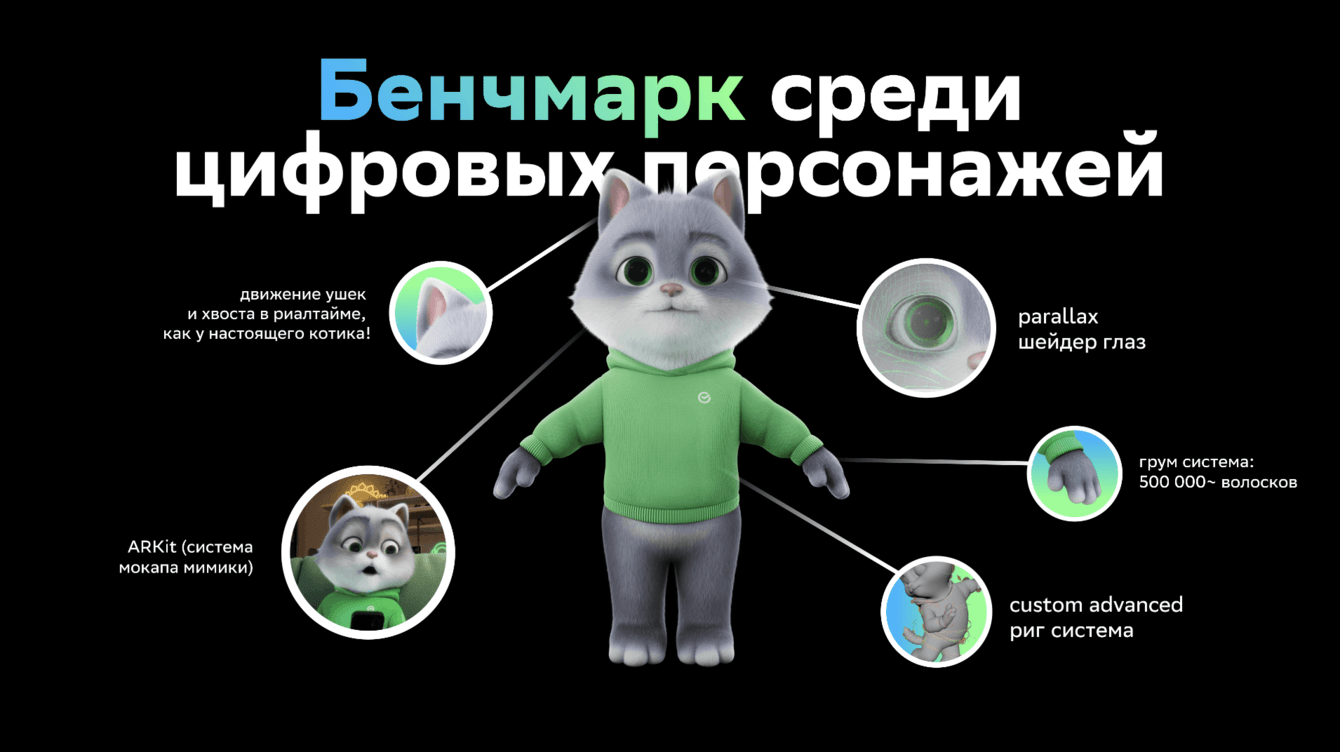 Real-time rendering: СберКот существует на базе игрового движка Unreal Engine, что позволяет интегрировать кота в различные активации в режиме реального времени с помощью костюма захвата движения.