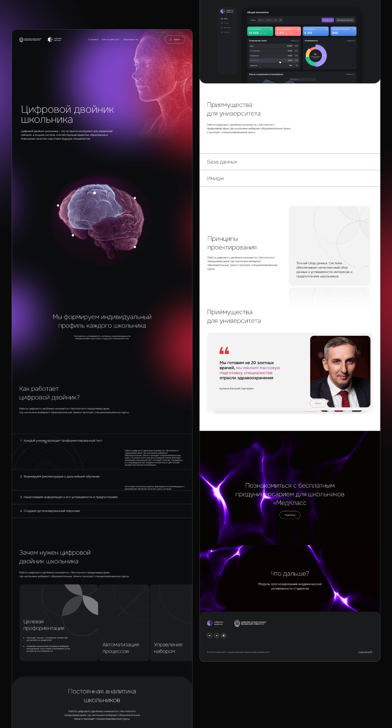 Предуниверсарий «МедКласс» — это бесплатная образовательная платформа для школьников, предназначенная для углубленной профориентации в области медицины, которую мы разработали несколько лет назад. В 2024 году мы внедрили в платформу систему цифровых двойников — виртуальных моделей, которые представляют собой цифровую копию школьников. Цифровой двойник анализирует профиль каждого пользователя, учитывая успеваемость, активность на платформе и взаимодействие с контентом и т. д. Это помогает отслеживать прогресс учащегося и выявлять у него области, требующие большего внимания. На основе собранных данных система предлагает индивидуальные рекомендации по улучшению учебного процесса. В итоге проект значительно улучшил процесс профориентации, сделал его более персонализированным, увлекательным и полезным. Благодаря интеграции цифровых двойников, школьники получают уникальную возможность выбрать профессию, которая подходит их интересам и способностям, а университет — подготовленных и мотивированных студентов. В будущем на основе успеваемости и интересов учащихся будет формироваться предполагаемая карьерная траектория, которая будет стимулировать поступать в СибГМУ. Для университета важно выстраивать устойчивую коммуникацию с потенциальными абитуриентами задолго до их поступления. Как правило, взаимодействием с учащимися школ занимаются подразделения, отвечающие за набор студентов. Они организуют профориентацию, мероприятия, дни открытых дверей и другие активности. Несмотря на сложность перевода таких процессов в цифровую форму, это вполне реализуемая задача.
