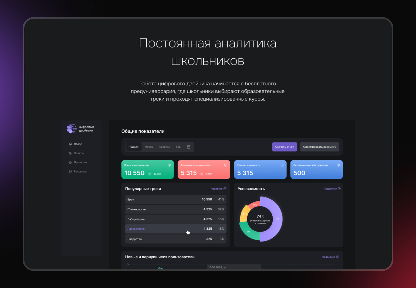 Цифровой двойник анализирует профиль каждого пользователя, учитывая успеваемость, активность на платформе и взаимодействие с контентом и т. д. Это помогает отслеживать прогресс учащегося и выявлять у него области, требующие большего внимания. На основе собранных данных система предлагает индивидуальные рекомендации по улучшению учебного процесса, например, дополнительные ресурсы по темам, в которых ребенок испытывает трудности, или предлагает альтернативные методы обучения, чтобы усилить сильные стороны и подтянуть слабые.