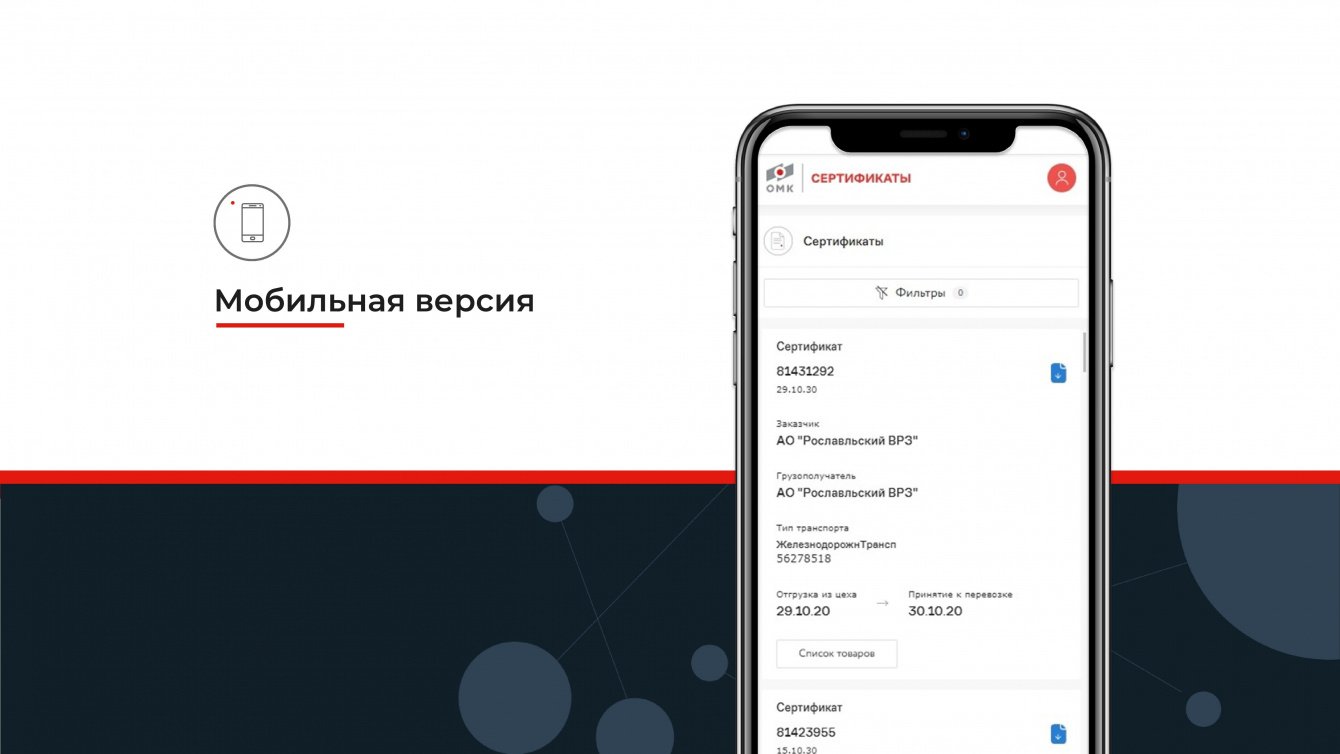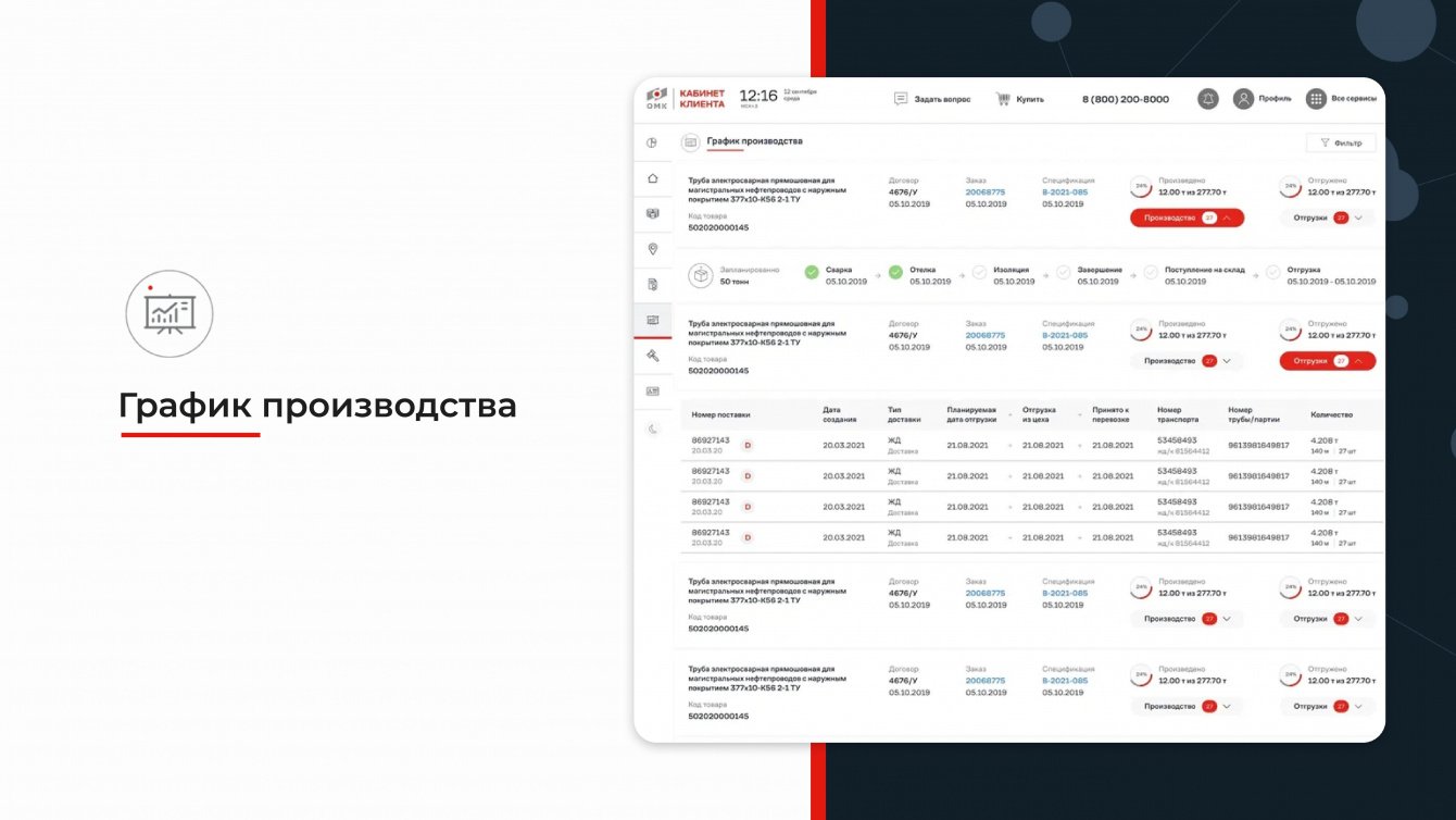 В результат был разработан не один продукт, а целая экосистема цифровых сервисов, в основе которых стремление к обоюдной операционной эффективности взаимодействия во всех точках касания. Это такие цифровые сервисы, как “Кабинет клиента ОМК”, “Сертификаты”, торговая площадка “Аукционы” , Интернет-магазин “Маркет”, сервис для управление логистикой - “Тарифы”, мониторинг ошибок “Административная панель” и другие.