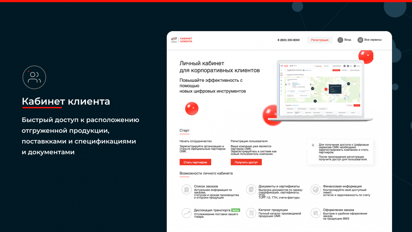 1. User-Friendly интерфейсом - зачастую не характерным для B2B-систем. Обслуживание через цифровые сервисы ОМК такое же простое, как в цифровых сервисах в банке, ритейле или телекоме, не смотря на сложность процессов, «громоздкость» внутренних систем и объема данных.