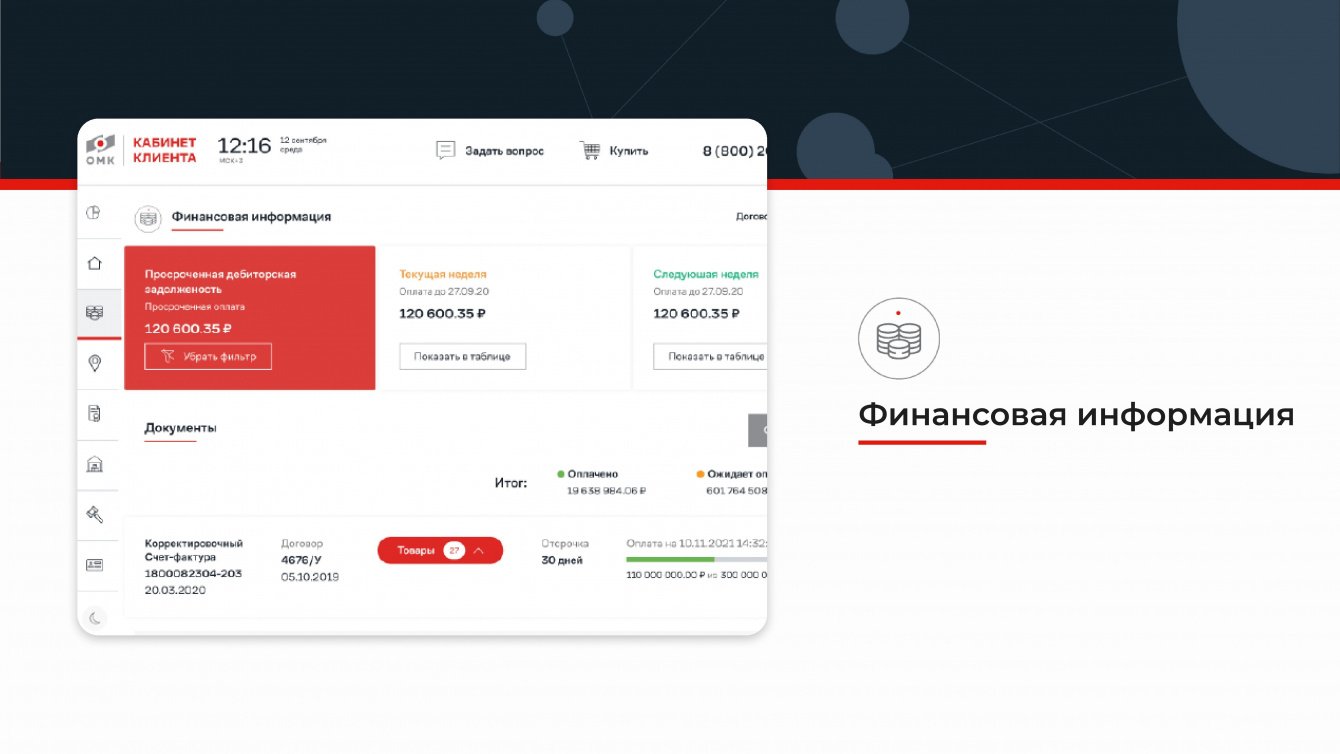 1. User-Friendly интерфейсом - зачастую не характерным для B2B-систем. Обслуживание через цифровые сервисы ОМК такое же простое, как в цифровых сервисах в банке, ритейле или телекоме, не смотря на сложность процессов, «громоздкость» внутренних систем и объема данных.