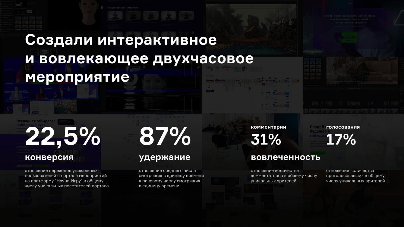 Проект значительно отличается от традиционных форматов онлайн-мероприятий. Мы внедрили вовлекающие механики из компьютерных игр, кино и рекламы, чтобы полностью захватить внимание аудитории до, во время и после мероприятий. Вариативность и необычная подача контента помогли добиться высокого коэффициента удержания зрителей, вовлечения их в происходящее на трансляции и в активности на портале даже спустя несколько дней после мероприятий.