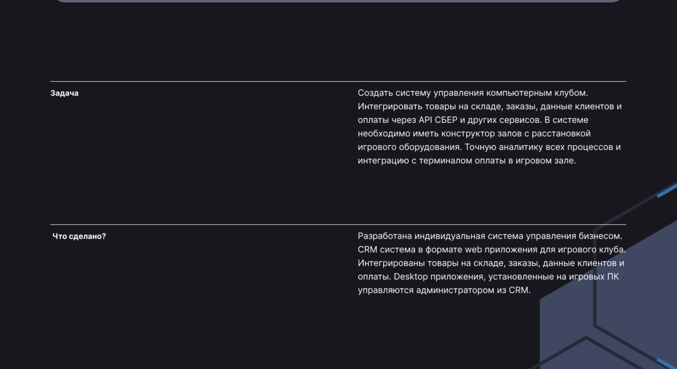3. Добавлены интеграции с API СБЕР и Видеонаблюдением. + В системе есть конструктор залов с расстановкой всего игрового оборудования. Установленные на игровых ПК Desktop-приложения управляются администратором из CRM.
