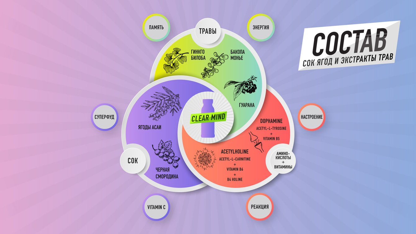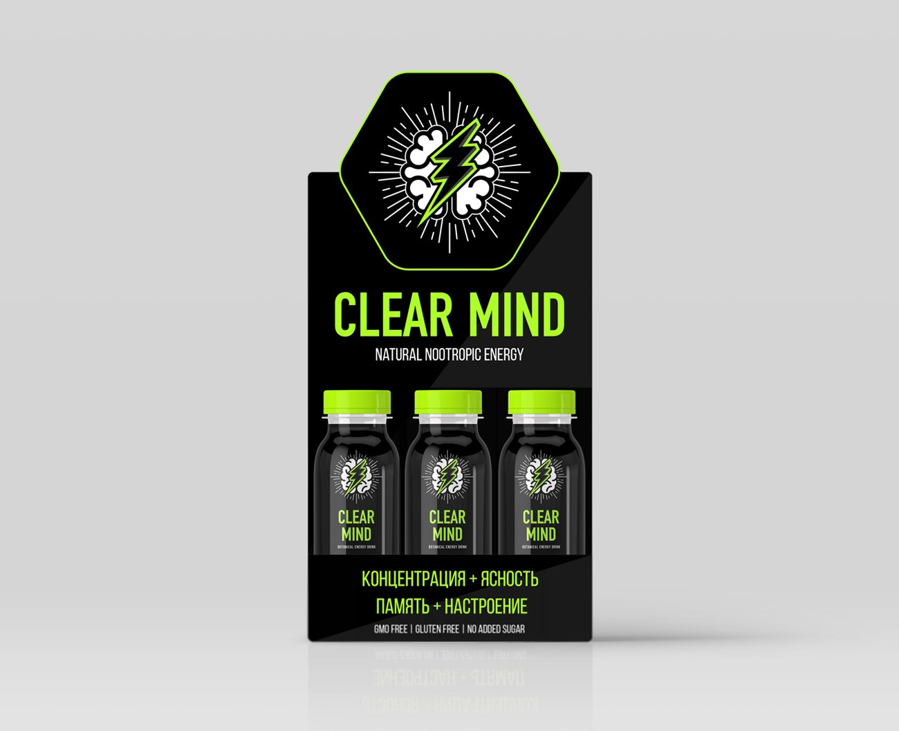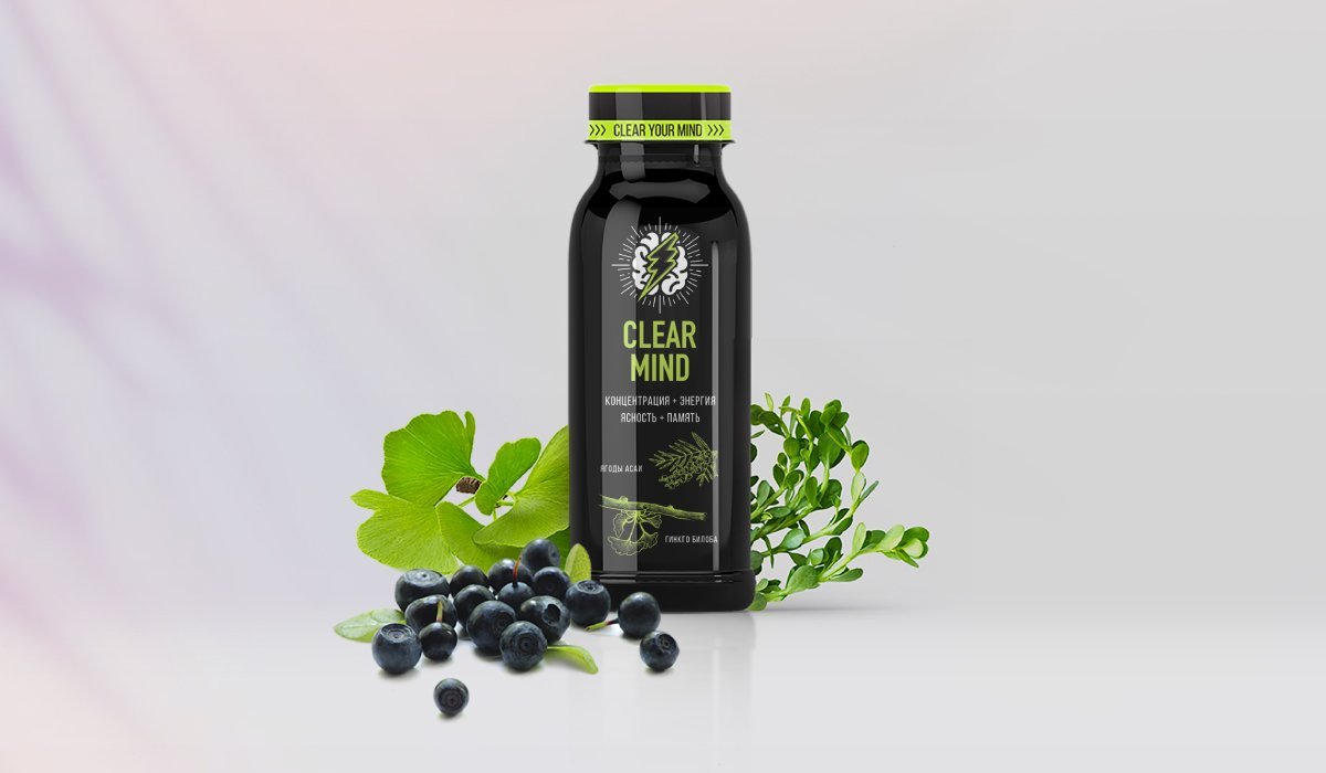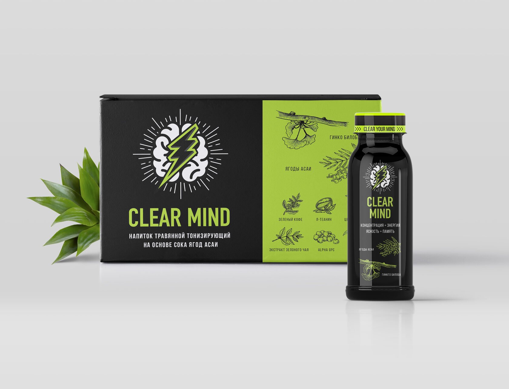 Комплексная разработка фирменного стиля для бренда Clear Mind — натурального энергетического напитка нового поколения с тщательно подобранным набором аминокислот, витаминов и трав, сочетание которых питает мозг и бодрит дух