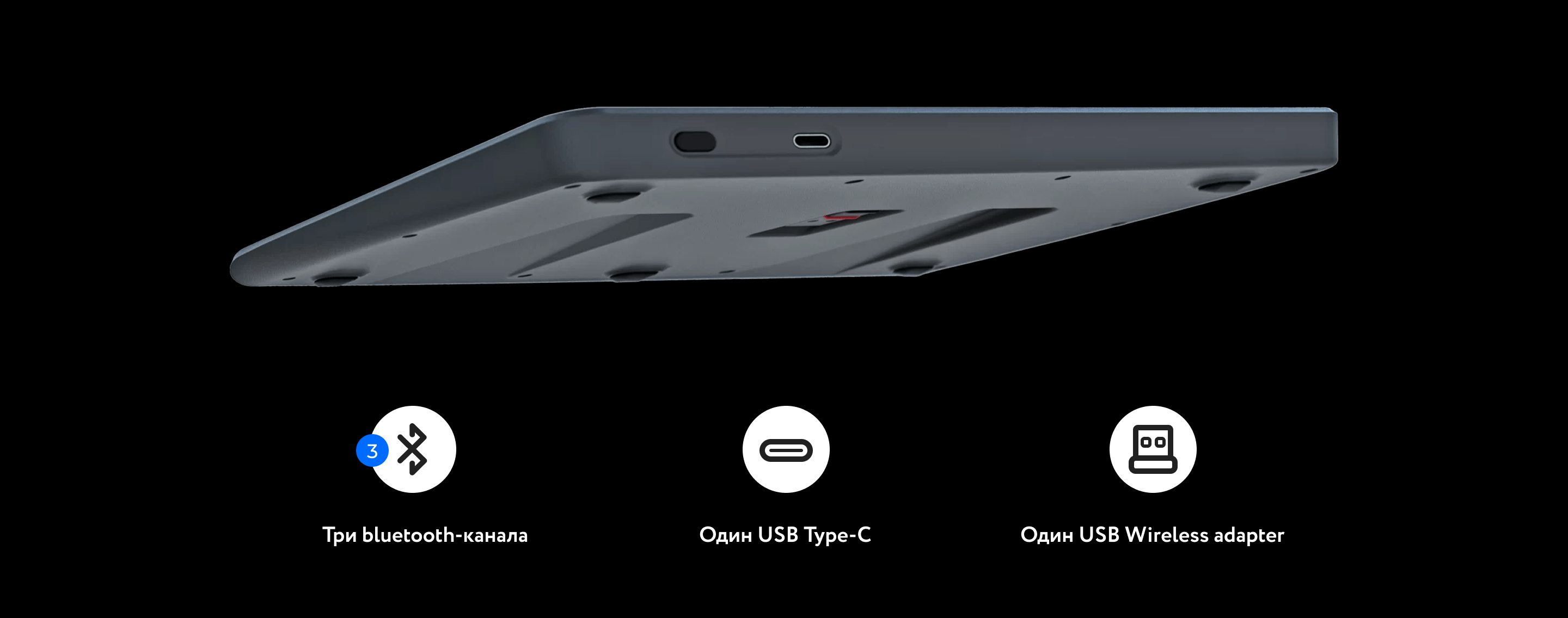 Клавиатура подключается к 5 устройствам одновременно: три — через Bluetooth, два других — через Radio USB и USB-провод.