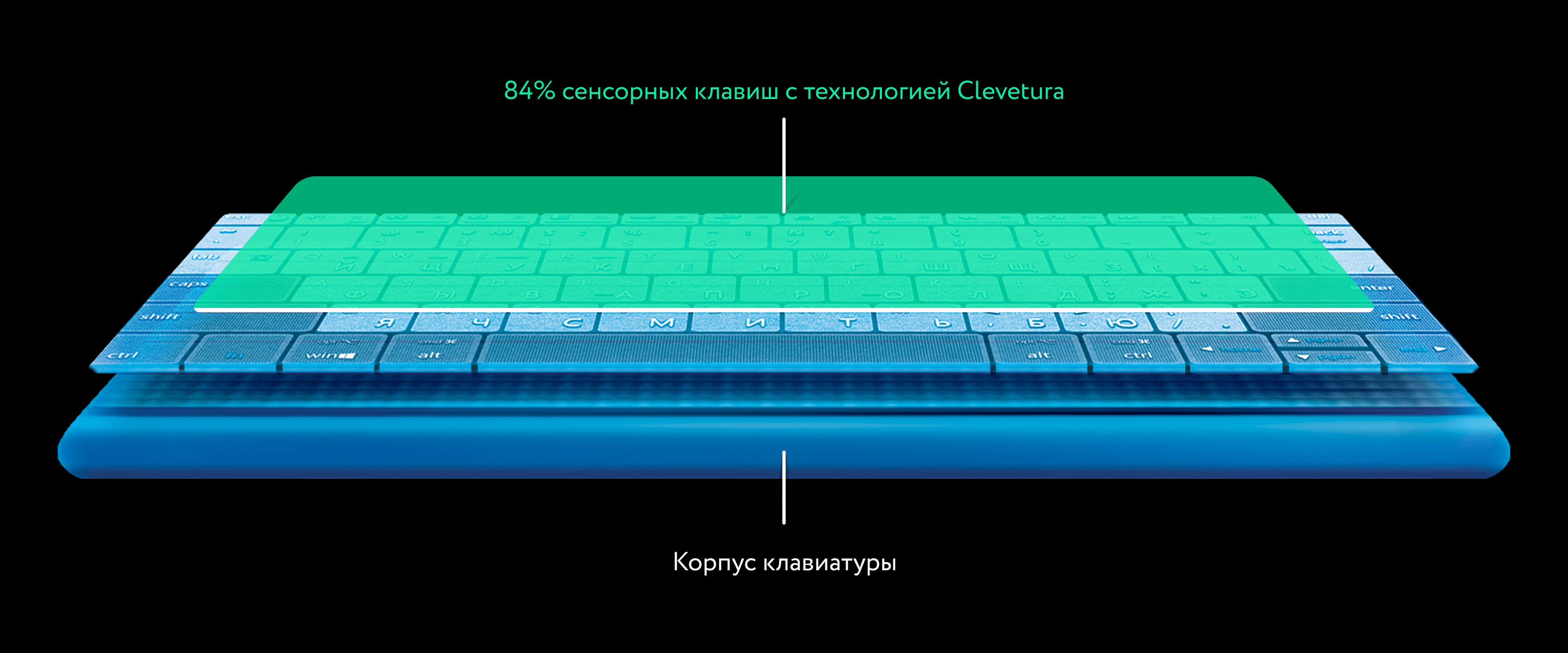 Клавиатура с Clevetura выглядит обычно, но внутри у нее ✨волшебство — сенсор с продвинутой логикой обучения. Он расположен внутри клавиш и распознает жесты пользователя: нажатия, скролл, тапы и клики.