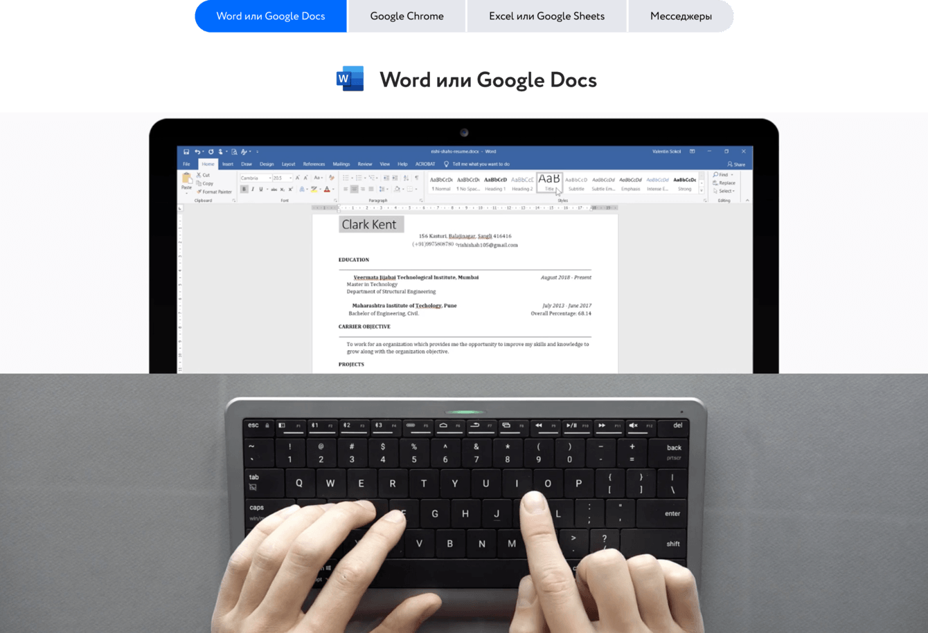В рассказе о технологии собрали все, что поможет пользователям быстро разобраться: основные жесты, преимущества и видео со сценариями. Нужно печатать — человек нажимает клавиши как обычно. Нужно проскроллить страницу или документ — проводит двумя пальцами по клавишам, как на обычном тачпаде.