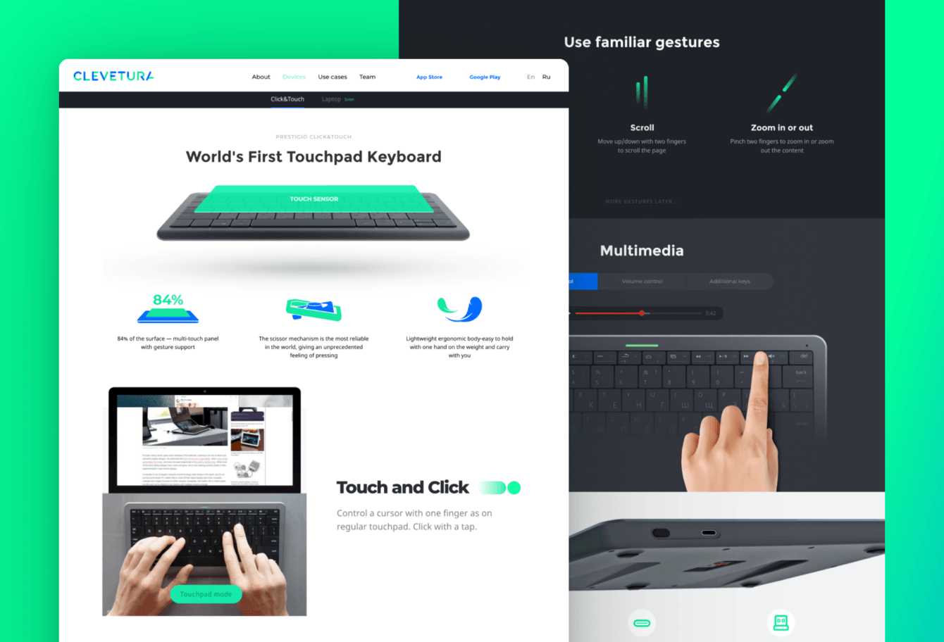 Основная проблема в том, что разница между технологией Clevetura и устройствами с ней, не всегда очевидна людям. Таких технологий на рынке раньше не было, и люди не представляют, как она работает и что это удобно. Выстраиваем рассказ на сайте отдельно о технологии и отдельно — об устройствах с Clevetura.