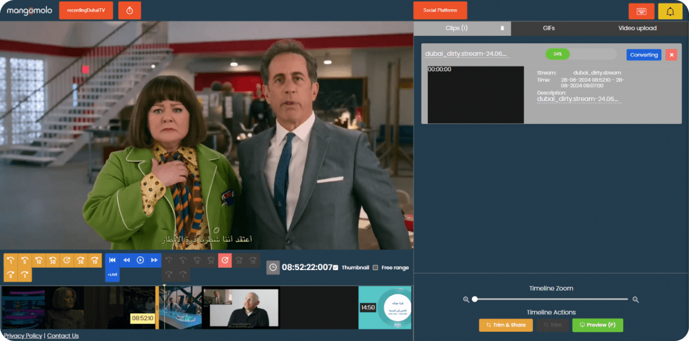 Мы создали сервис, который позволяет работать с неограниченным количеством прямых трансляций и записей, предоставляя возможность выделять интересующие моменты любой длины прямо в браузере. Встроенная студия обработки видео дает пользователю возможность добавлять изображения, текстовые элементы, звуковое сопровождение, другие видеоматериалы, а также заставки для создания завершенного ролика. После обработки пользователь может либо скачать готовое видео, либо поделиться им в социальных сетях через интегрированные API.