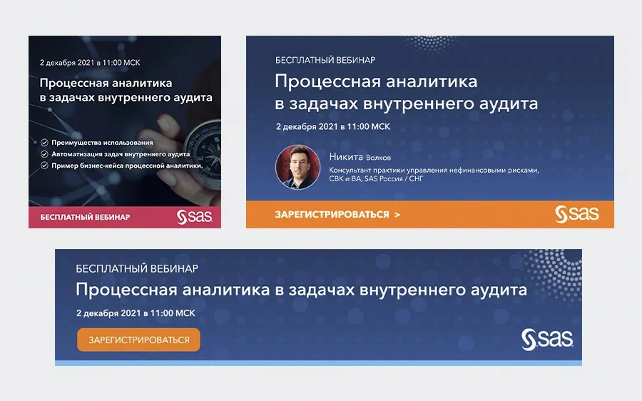 В соответствии с брендбуком мы разработали 2 варианта креативов, которые тестировали в ходе рекламной кампании. В креативах основной акцент сделали на ключевой информации каждого мероприятия: дате, времени проведения и содержании вебинара.