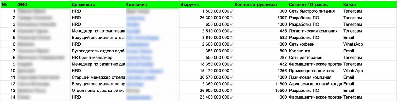 Отработали 951 самых крупных компаний в секторе производства и агропромышленности, где были сильные кейсы и получили 9 лидов, CV 0,95%.