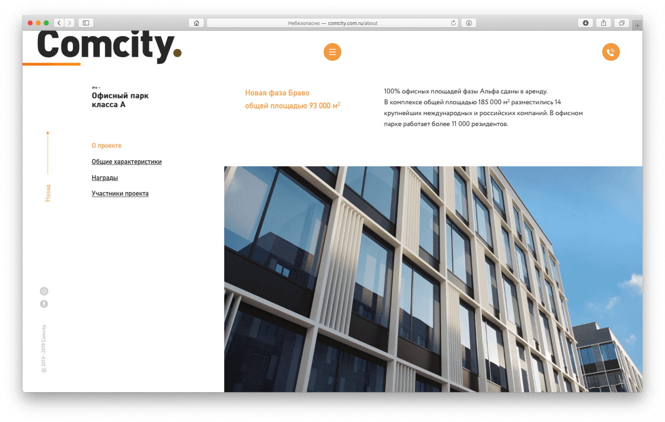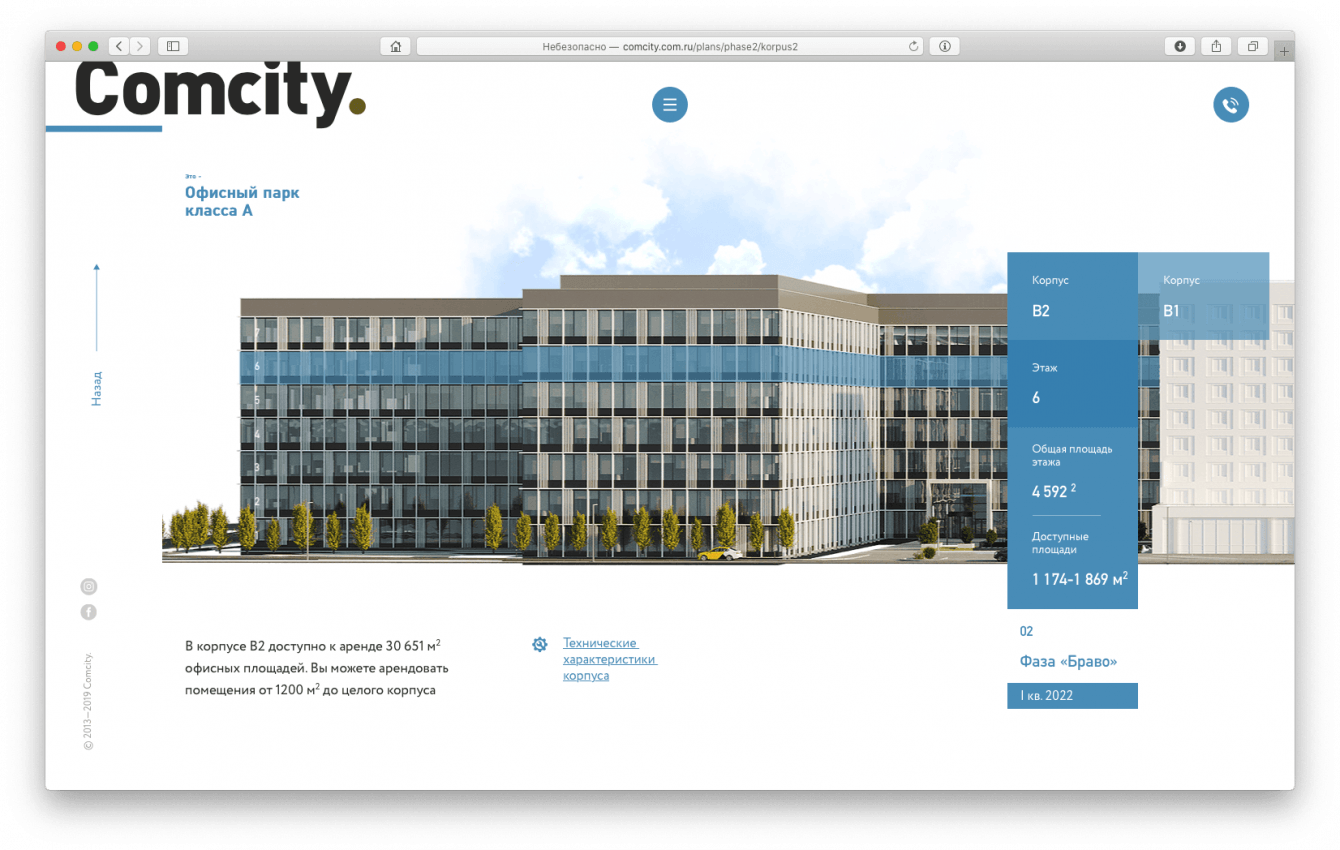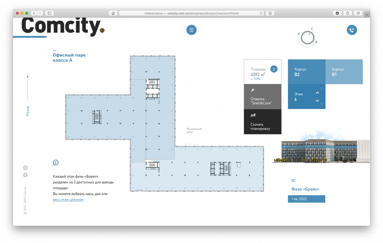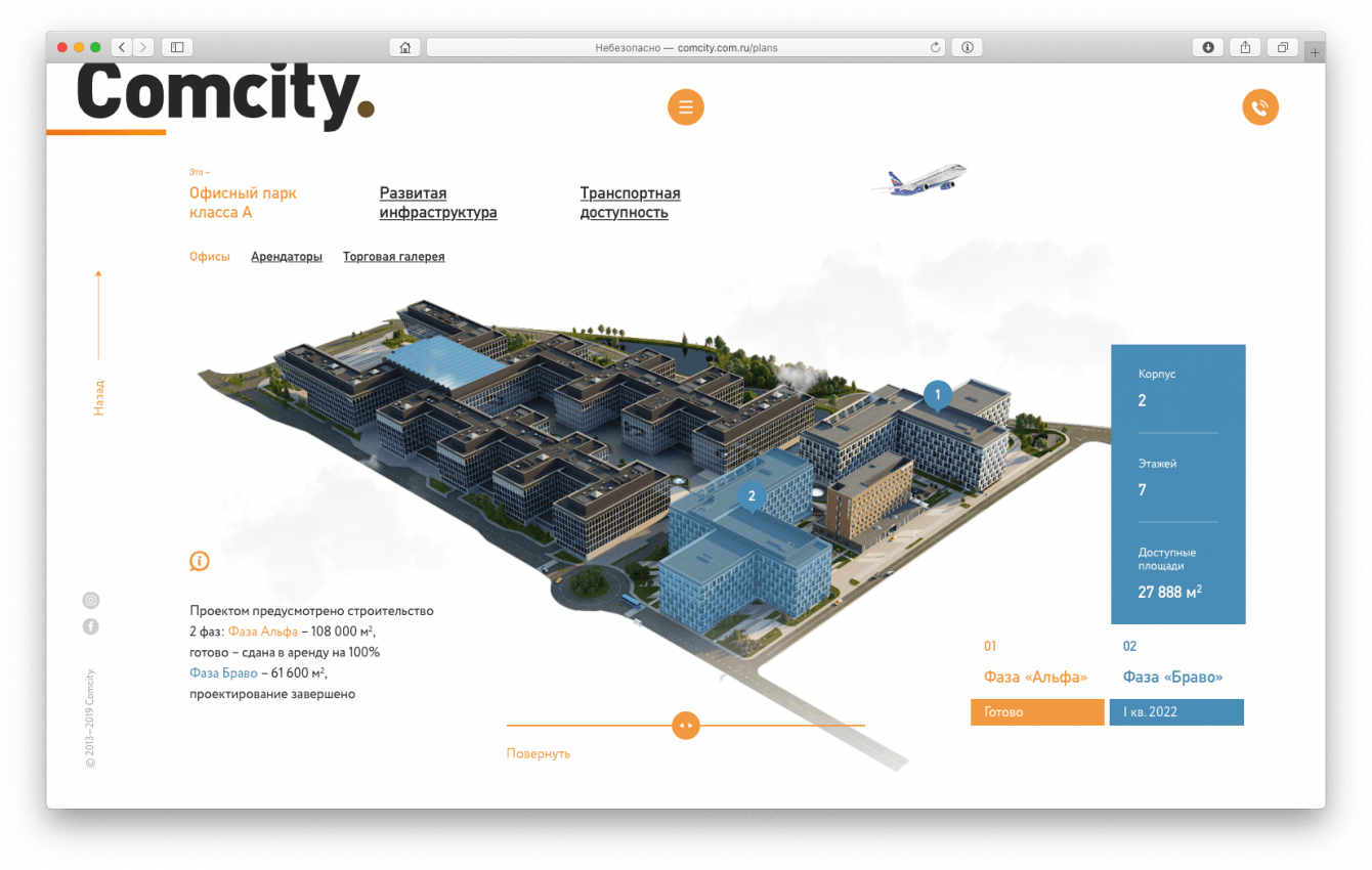 Изюминкой проекта стала интерактивная карта комплекса, сделанная в 3D, на которой можно не только выбрать офисные площади новой фазы, но и наглядно познакомиться с жизнью существующей очереди проекта.