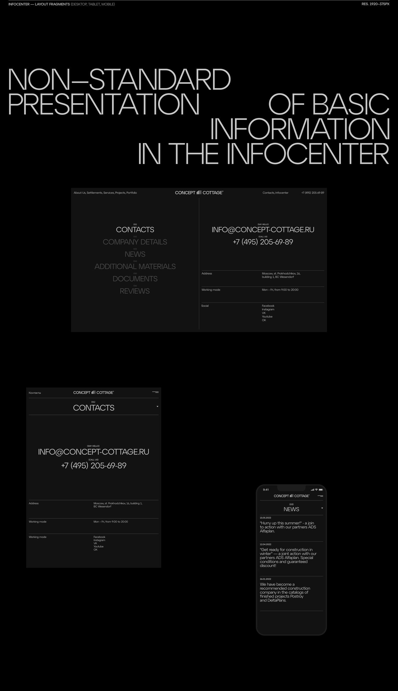 Для основной цветовой гаммы подобрали спокойные холодные оттенки серого в сочетании с классическими черным и белым. А вот типографика выстроена на контрастах и смешении стилей.