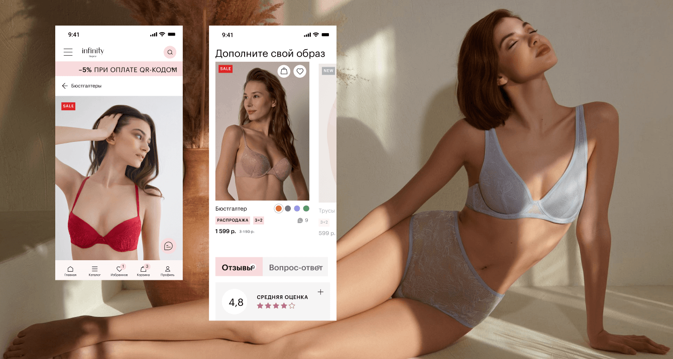 Мы договорились с клиентом выпускать в продакшн новые интернет-магазины итерационно. MVP-проектом стал магазин нижнего белья Infinity Lingerie. Его посещаемость наиболее прогнозируемая, товарная база меньше, чем у двух других магазинов, при этом на нём можно было отработать гипотезы, собрать обратную связь и раскатить выявленные изменения на остальные площадки.