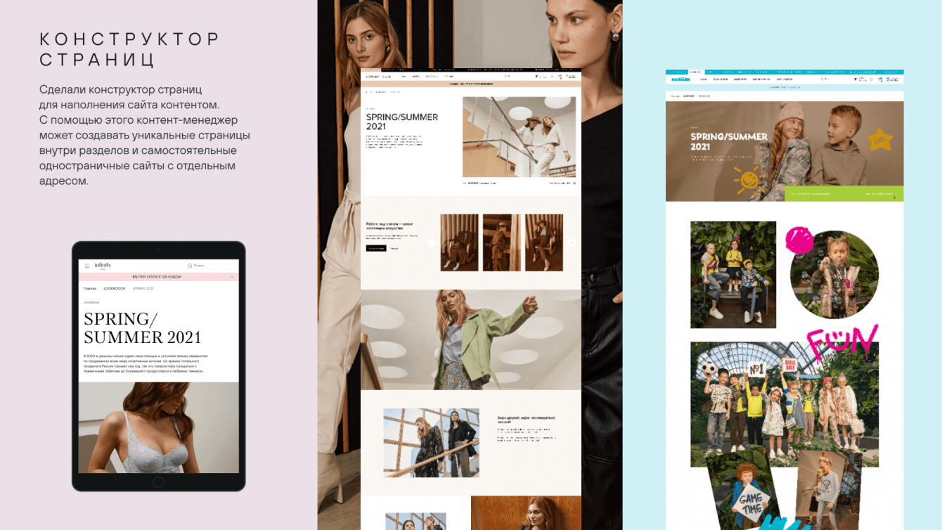 Дизайн каждого магазина уникальный, соответствует собственной бренд-айдентике, но мы также разработали универсальные макеты для пересекающихся сценариев. Дополнительно мы разработали визуальный конструктор страниц, с помощью которого контент-менеджеры могут самостоятельно создавать страницы из блоков.