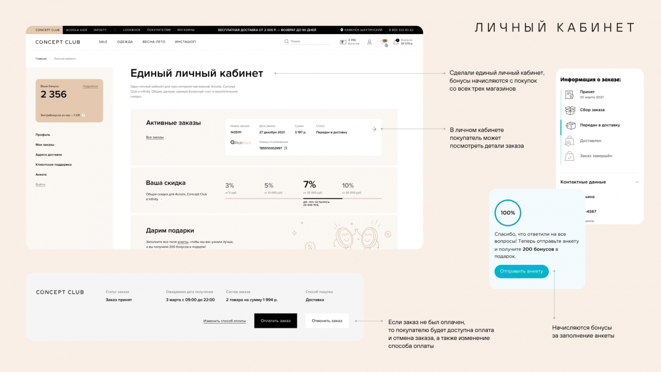 Одним из плюсов схемы «3 магазина на одном ядре» стала возможность сделать общий личный кабинет покупателя для трёх брендов. Теперь покупатели могут видеть заказы из разных магазинов в одном интерфейсе, тратить баллы, накопленные, например, при покупке белья в Inflin на одежду из Concept Group. Это удобно для пользователей и выгодно для бизнеса.