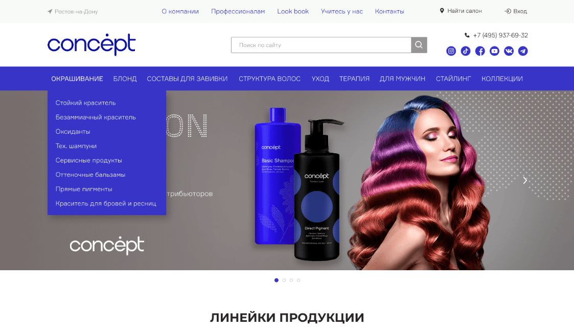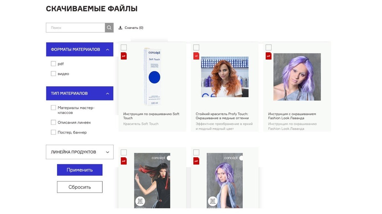 Рассказать об ассортименте бренда Concept: удобно и доступно для пользователя предоставить необходимую информацию по ассортименту, технологиям использования и др.