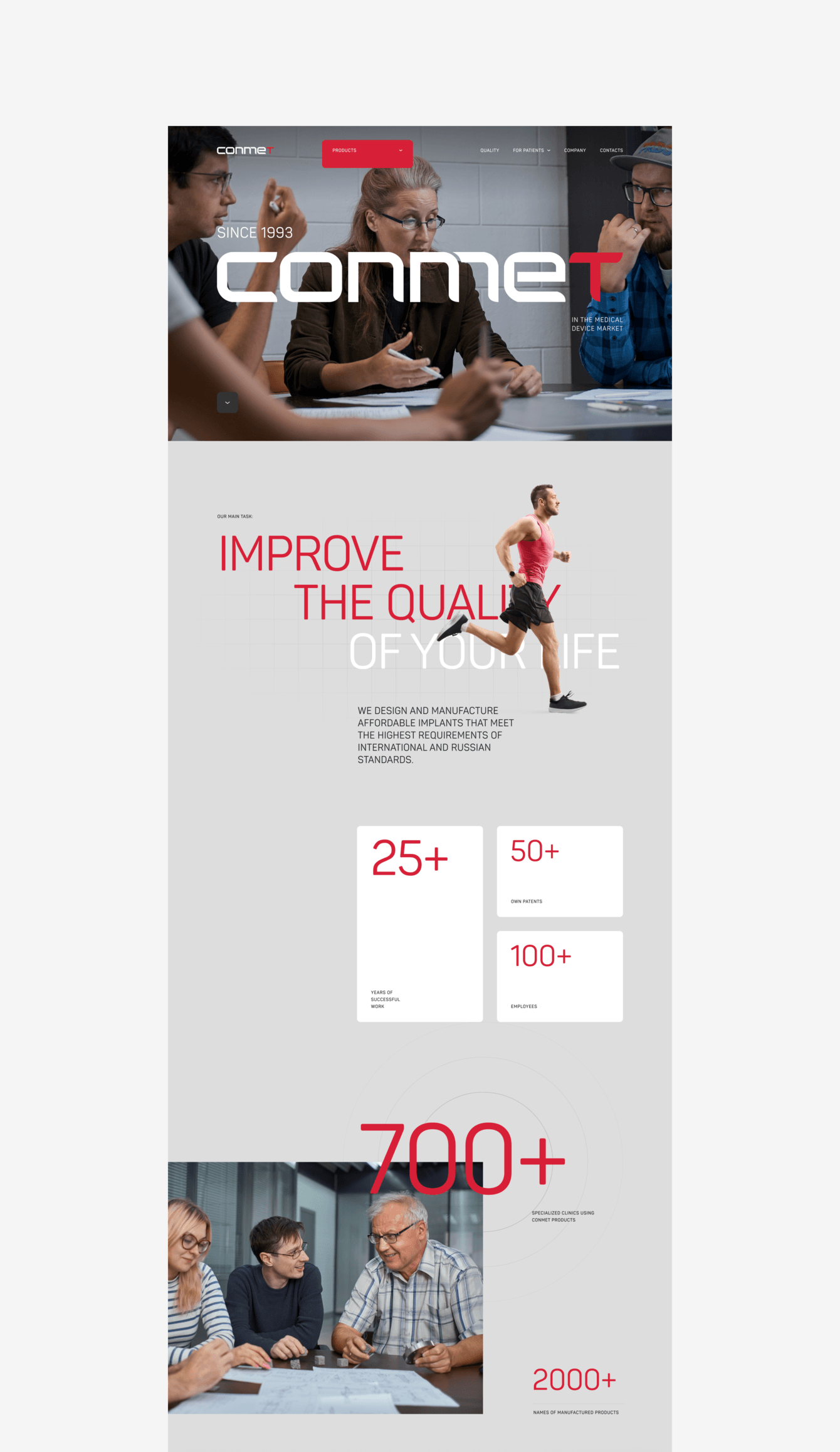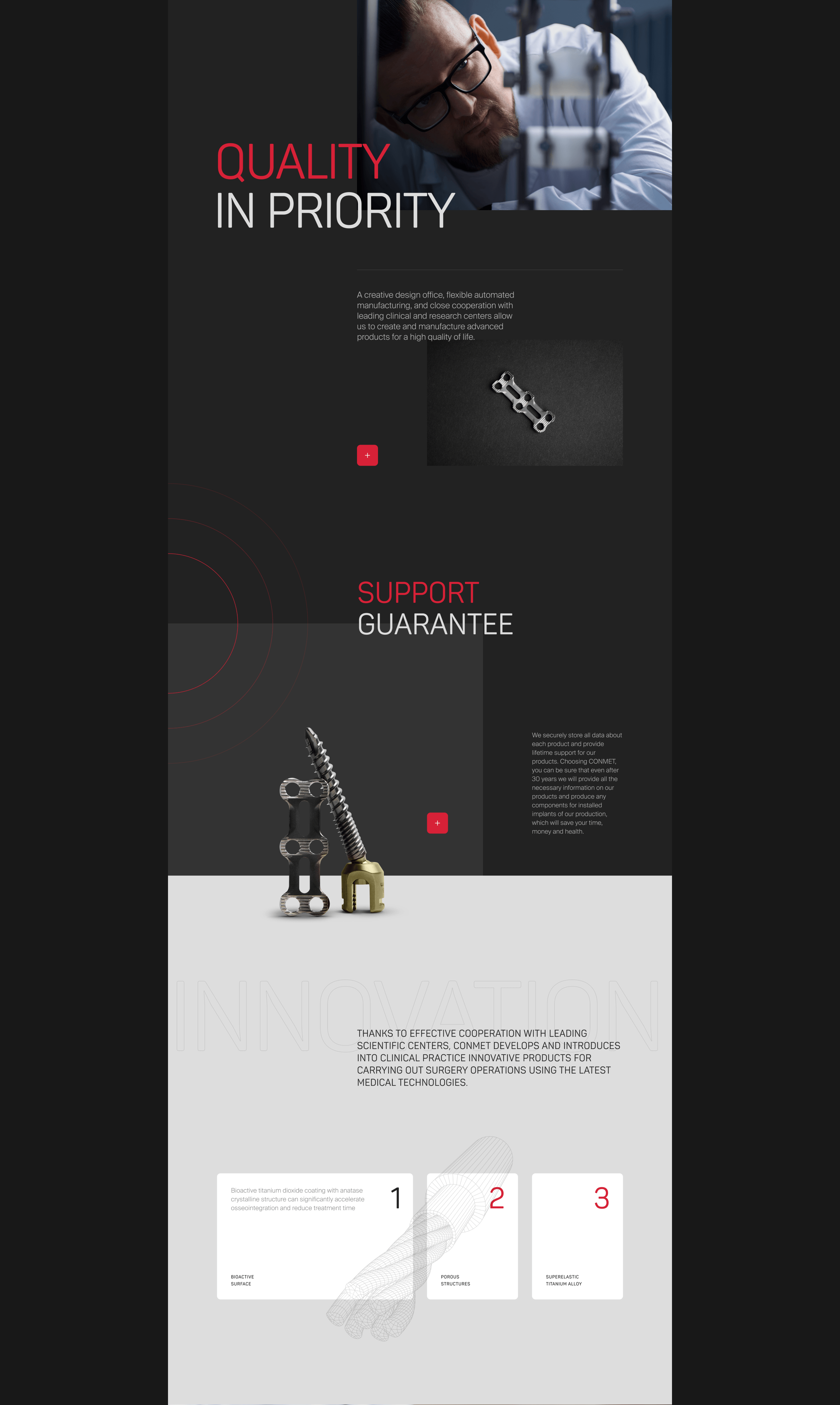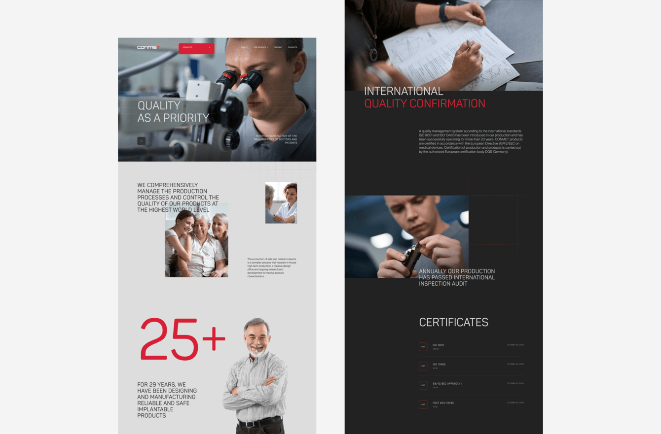 Ключевой атрибут, важный для всех аудиторий — качество продукции. Мы акцентируем его на главной странице и проводим красной нитью через весь сайт. Например, подчеркиваем, что культура качества реализована в подходе к работе: сотрудники Conmet горят идеей разрабатывать и создавать превосходные импланты.