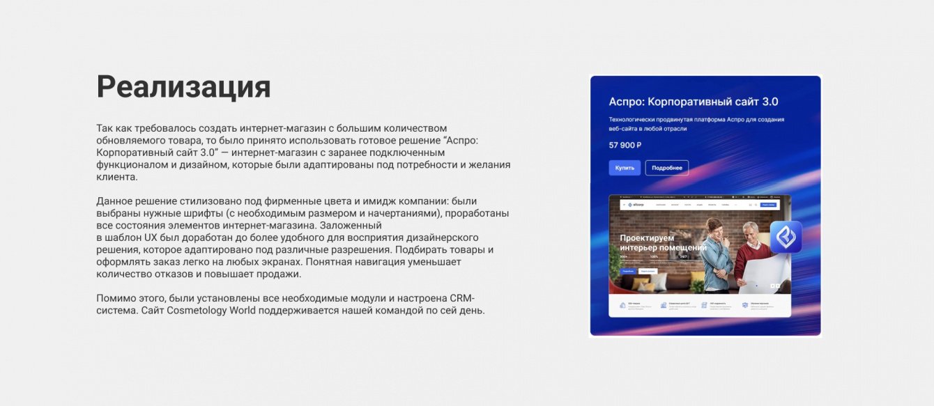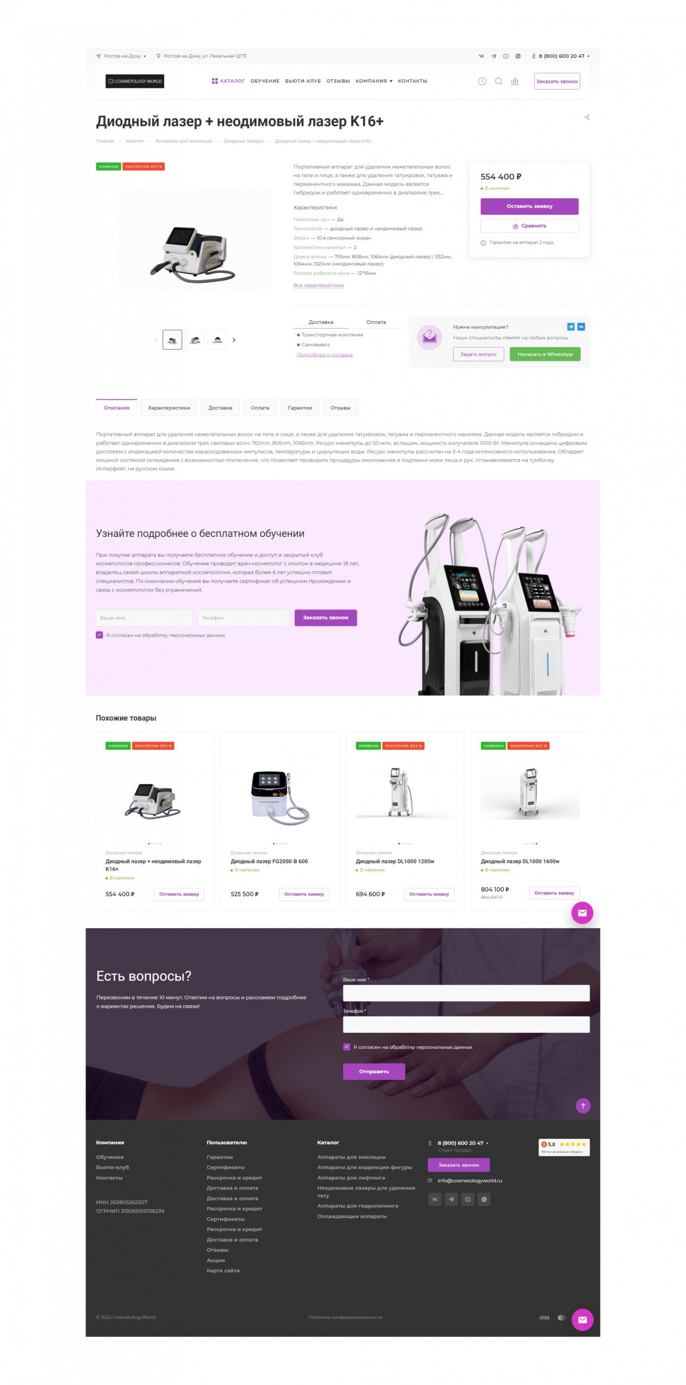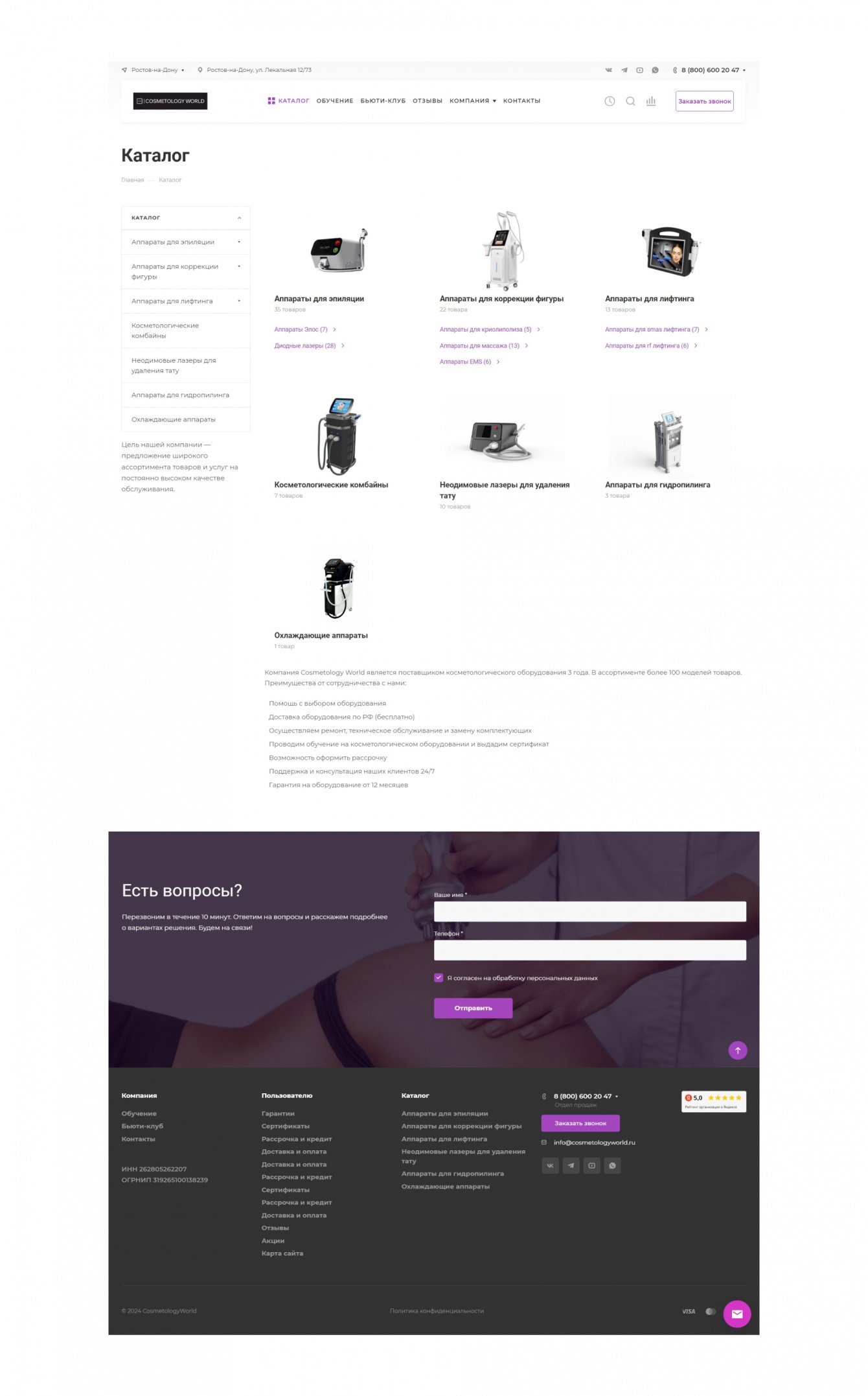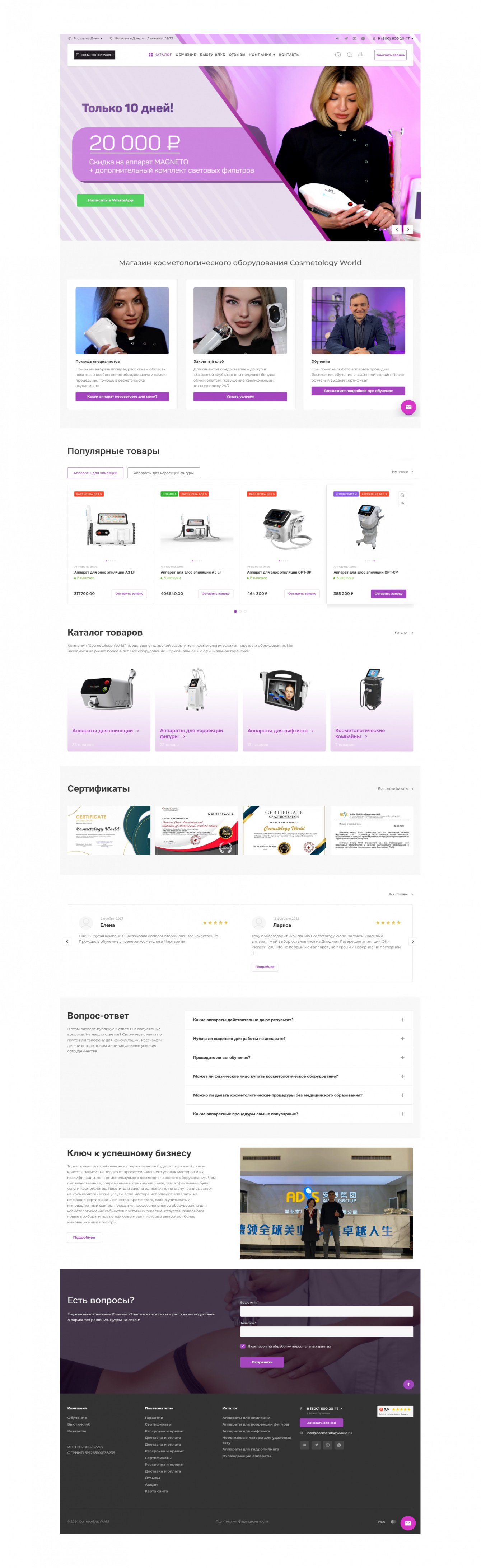 Интернет-магазин Cosmetology World выполнен в соответствии с поставленными целями - удовлетворяет потребностям клиента и позволяет получать новые заявки. Оформление и навигация выглядят удобно и интуитивно понятно, подчеркивая при этом имидж компании. CRM настроена и позволяет управлять поступающими заявками. Техническая поддержка предоставляется нашей компанией на текущий момент времени.