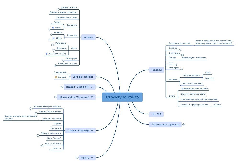 1. Построена структура сайта. На основании проектной аналитики строится структура сайта и отмечаются функциональные особенности, которые стоит реализовать в проекте с целью облегчения жизни как клиентам компании, так и сотрудникам, которые взаимодействуют с сайтом/сервисом.