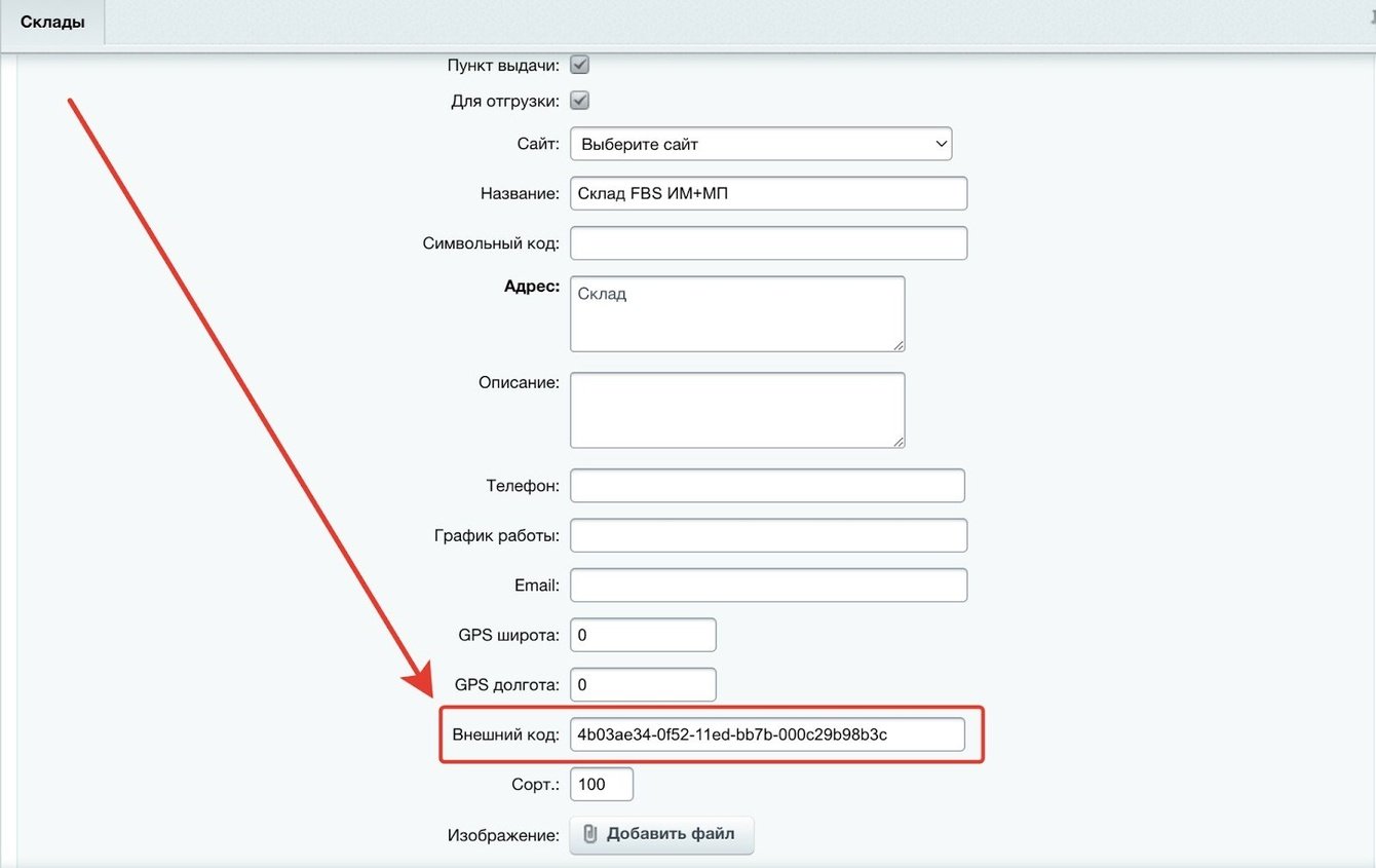 В поле «Внешний код» на стороне сайта в настройках используемого склада