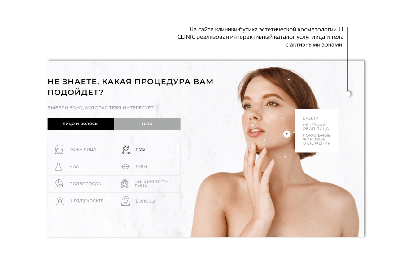 Этот функционал позволяет посетителям сайта выбирать конкретную зону лица или тела, чтобы получить информацию о связанных с ней услугах. Когда посетитель наводит курсор на определенную зону лица или тела, эта зона становится активной, указывая на то, что она выбрана. После выбора зоны открывается окно или панель с перечнем связанных с выбранной зоной услуг. Здесь посетитель может увидеть название услуги, краткое описание, возможные результаты и другую полезную информацию.