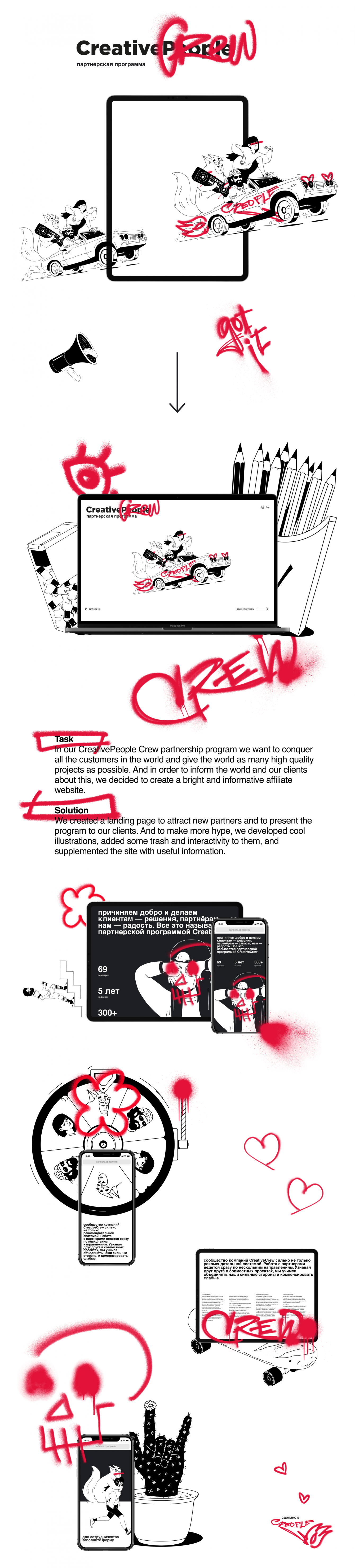 В рамках нашей партнерской программы CreativeCrew мы хотим завоевать всех клиентов на свете и подарить миру как можно больше качественных проектов. А чтобы поведать об этом миру и нашим клиентам, мы решили создать яркий и информативный сайт партнерки.