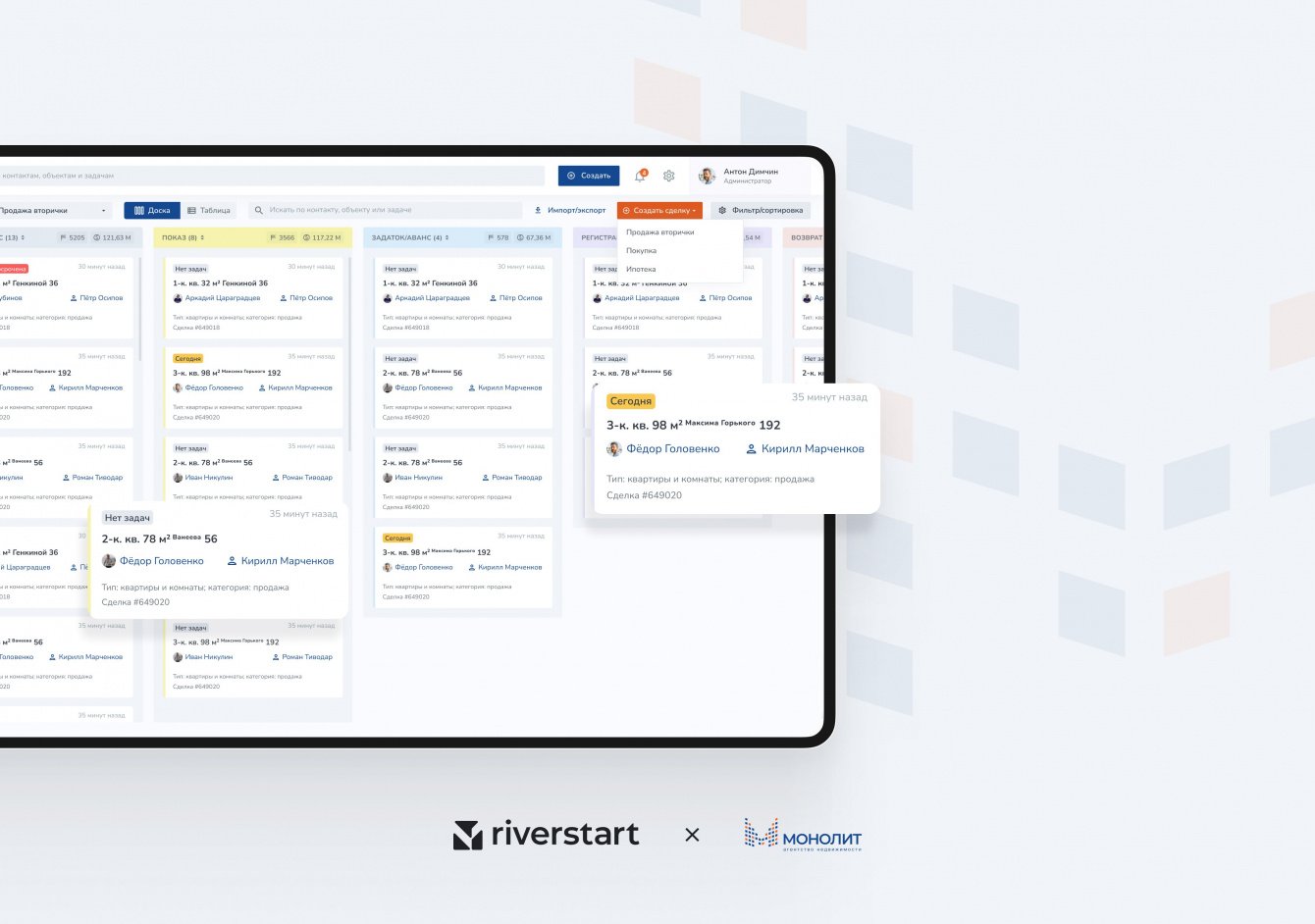 Компании «Монолит» нужна отдельная CRM, позволяющая контролировать все операции риелторов — ведение сделок, запуск рекламных кампаний и парсинг объявлений с досок недвижимости.