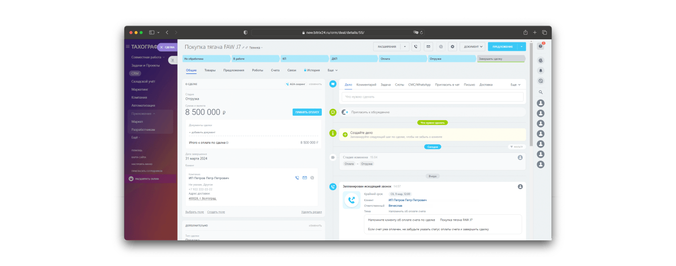 Идея внедрить CRM в работу отдела продаж фур и прицепов появилась давно: хотелось больше системности и контроля всех этапов сделки. Кроме того, привычный Excel не позволял автоматически актуализировать информацию о складских остатках. А в нашей работе – это риск продать один и тот же товар дважды.