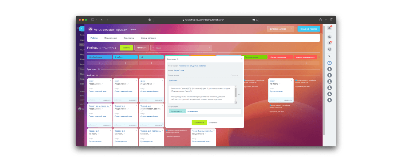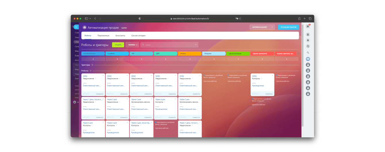 Для упрощения рабочего процесса с помощью роботов и триггеров Битрикс24 была реализована автоматизация. Роботы выполняют такие задачи, как отправка писем, создание документов, формирование счетов и платежных ссылок. Это способствует более эффективному продвижению сделок через воронку продаж и снижает количество рутинной работы.
